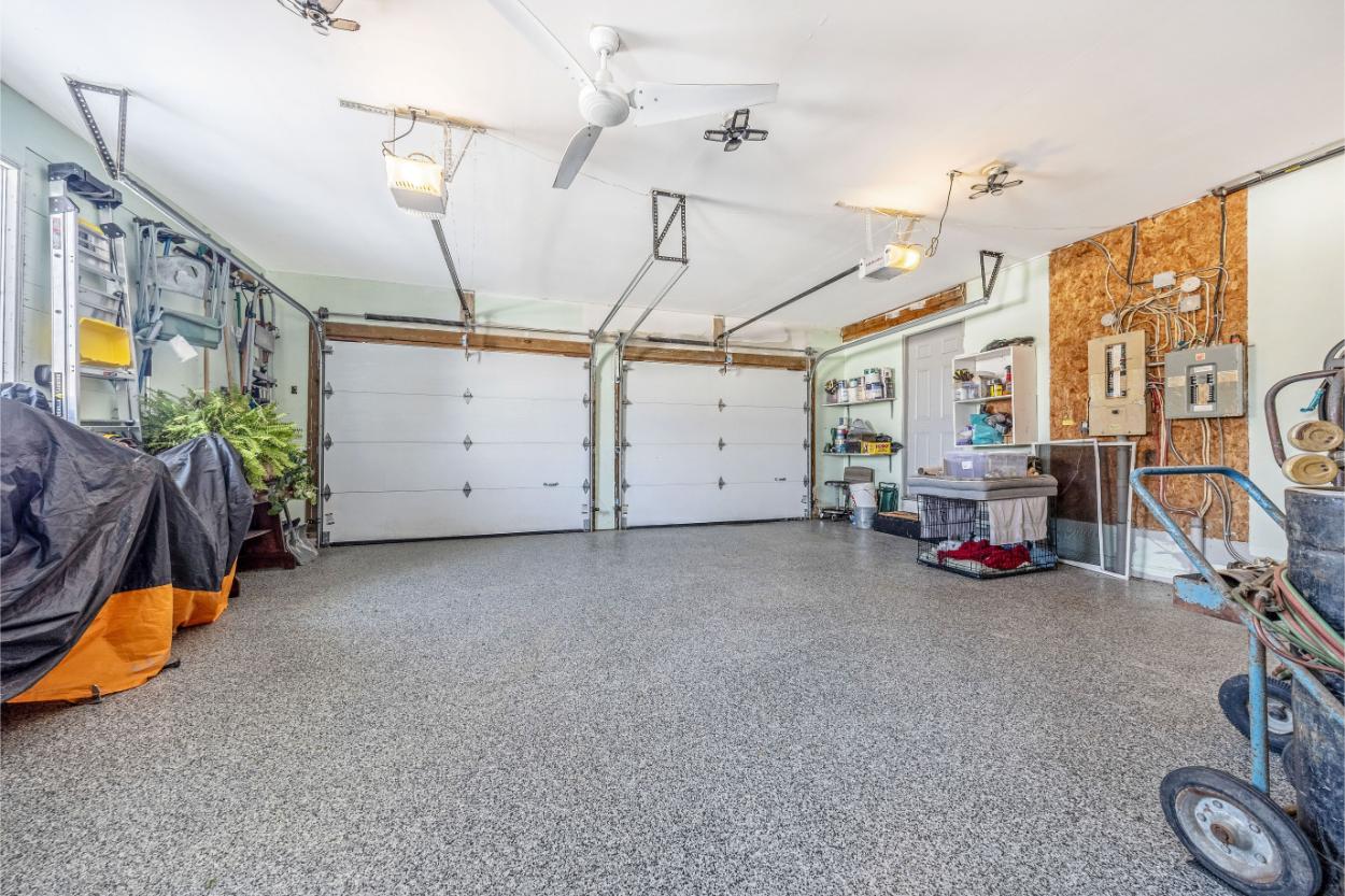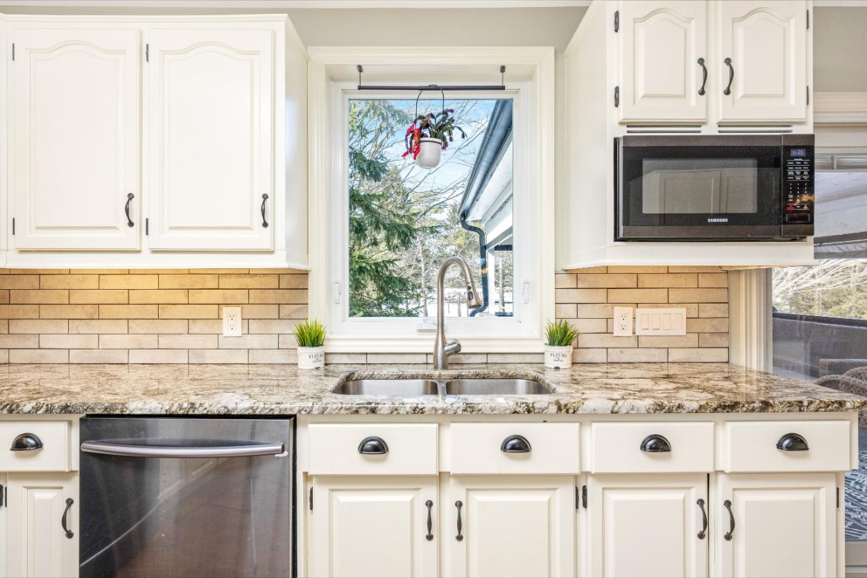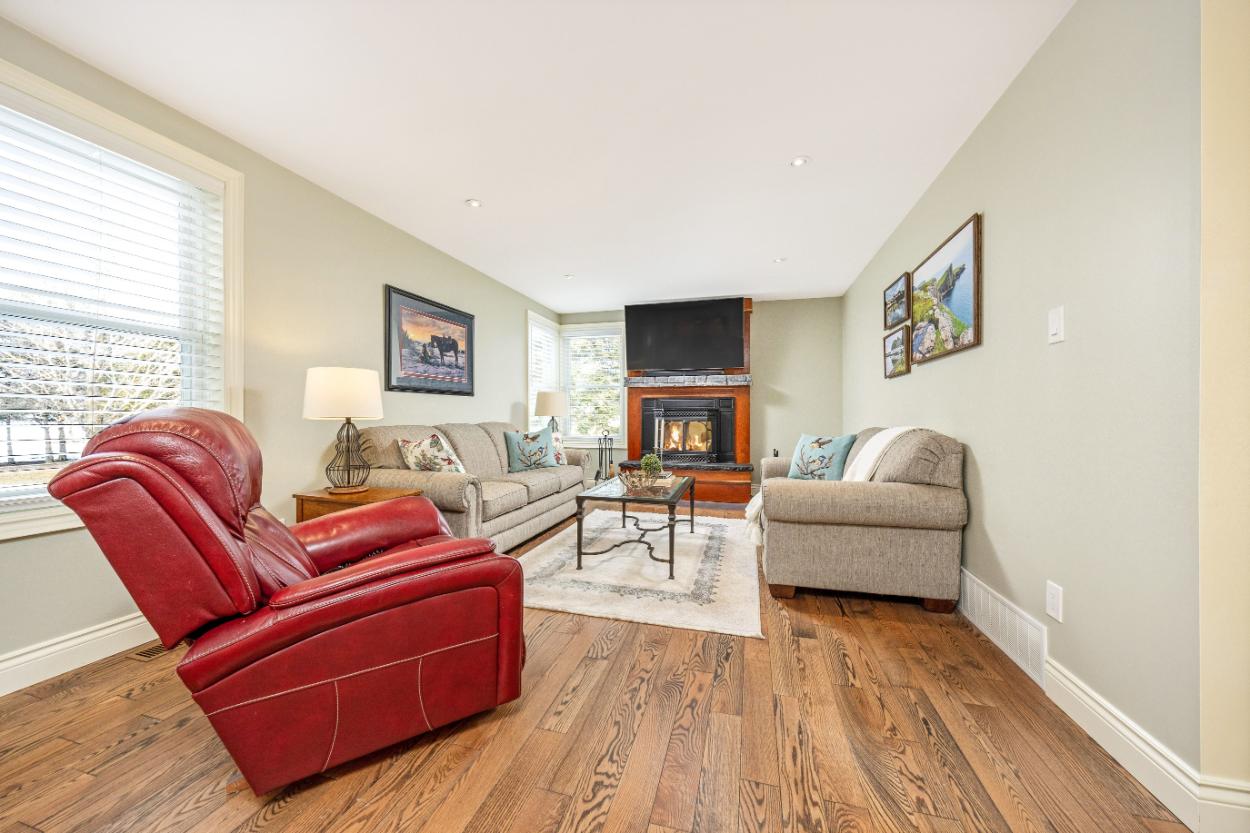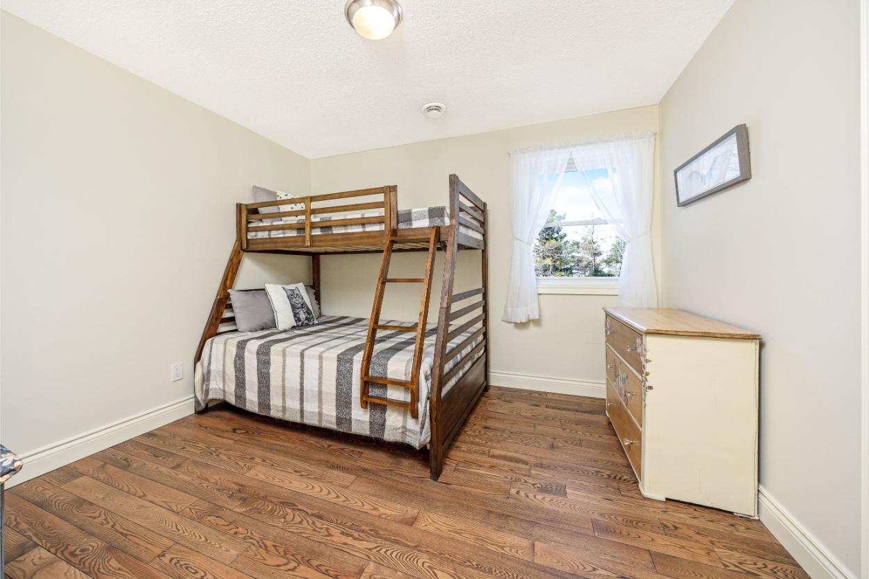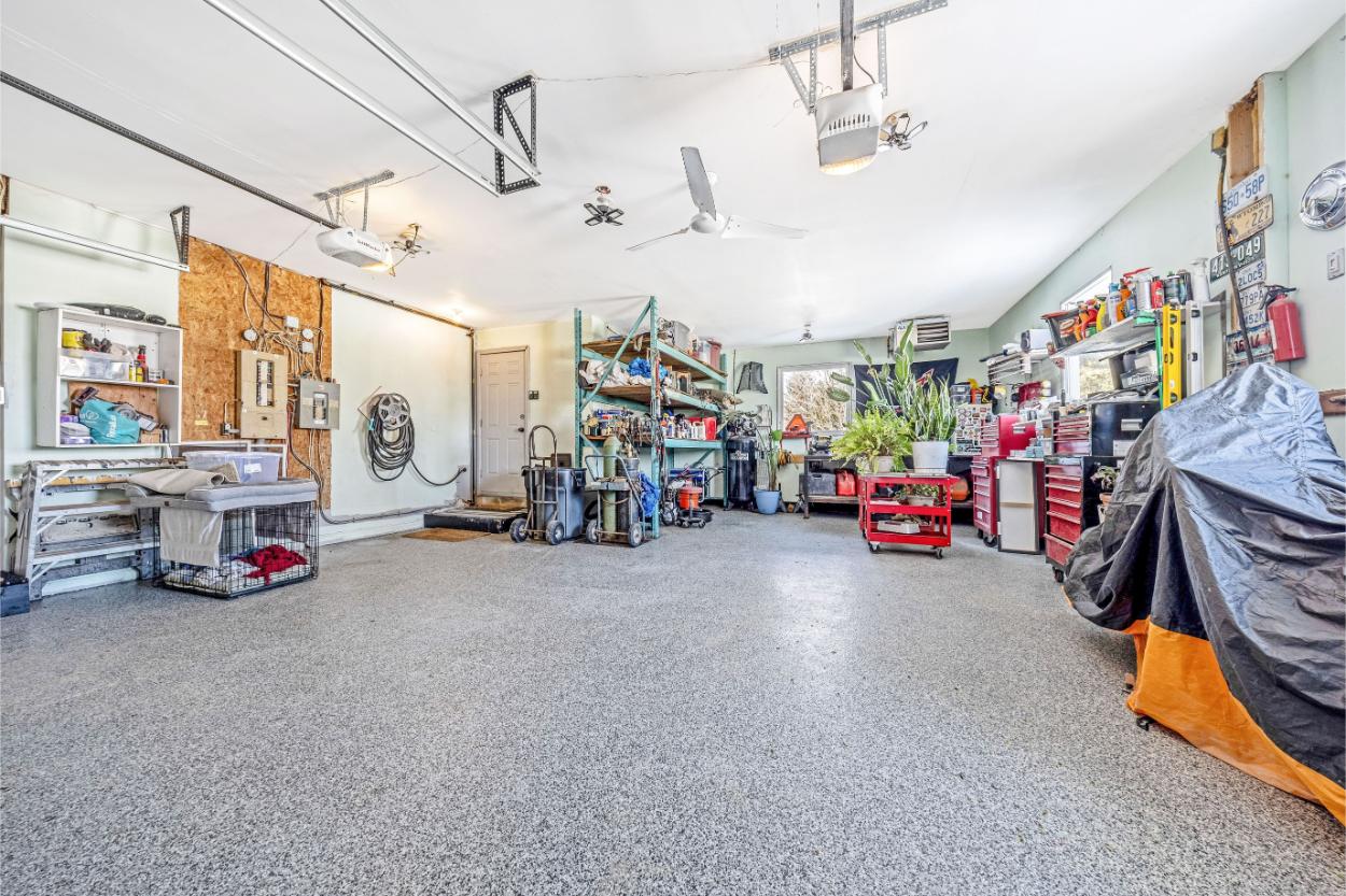 Outside, the long paved driveway provides plenty of parking and leads to the oversized double garage with epoxy floors. The property itself is surrounded by mature trees and scenic views, offering a private and peaceful setting while backing onto the trail system.