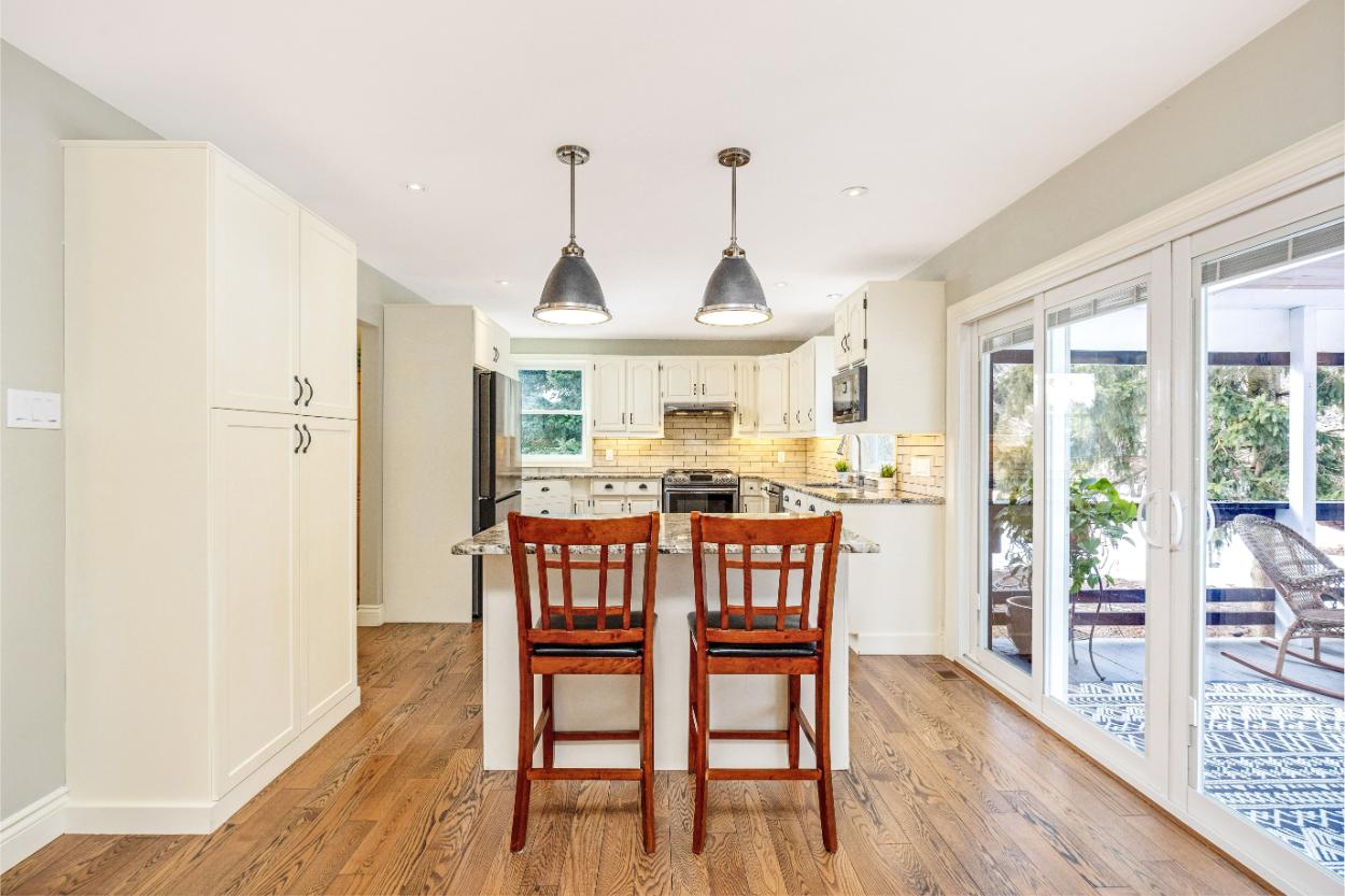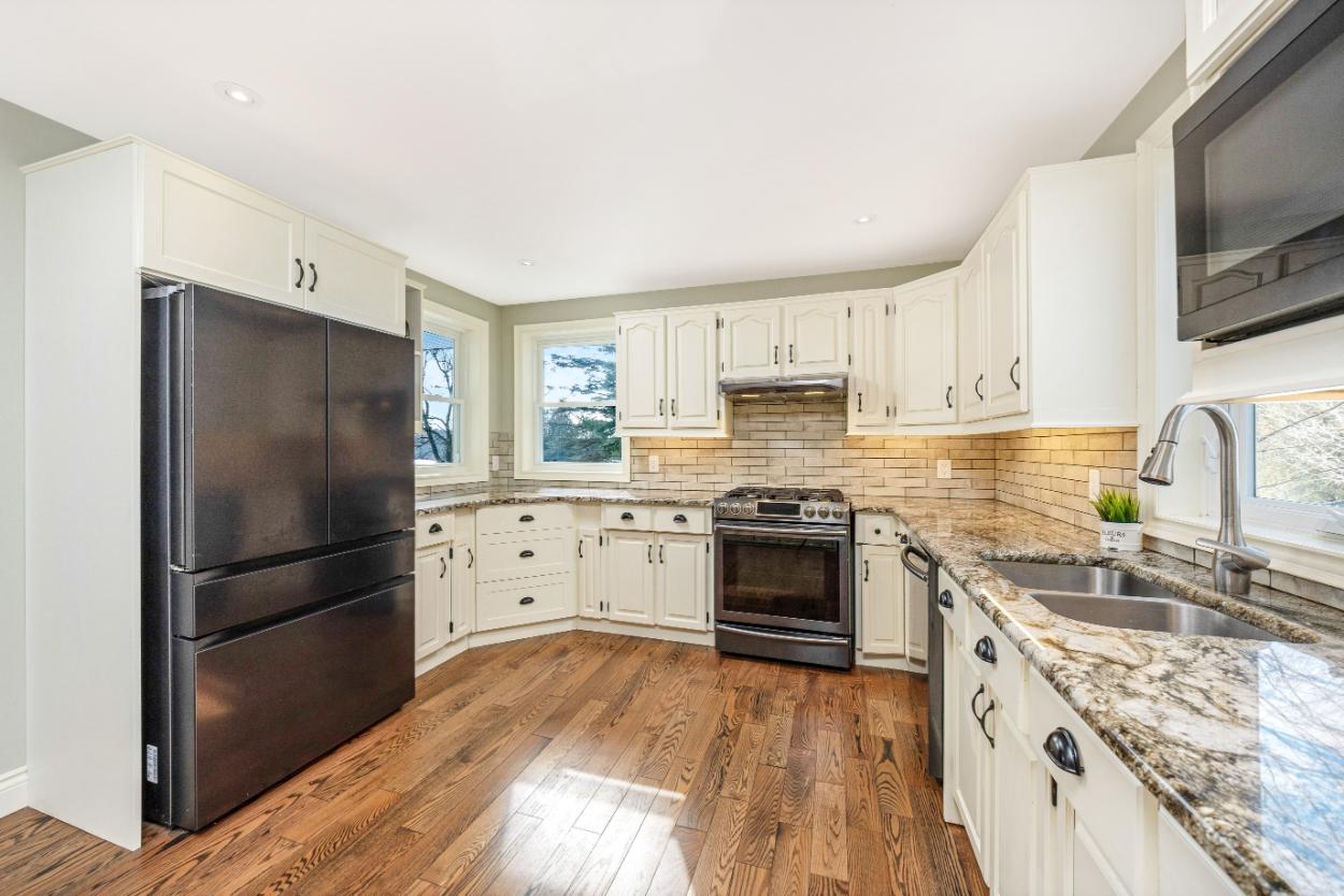 Bright and spacious principal rooms provide comfortable everyday living and great spaces for entertaining. The beautifully updated kitchen features granite countertops, shaker style cabinetry, tile backsplash and all new appliances. A convenient sit up breakfast bar is perfect for casual dining, while the open layout allows the kitchen to flow seamlessly into the main living spaces.
