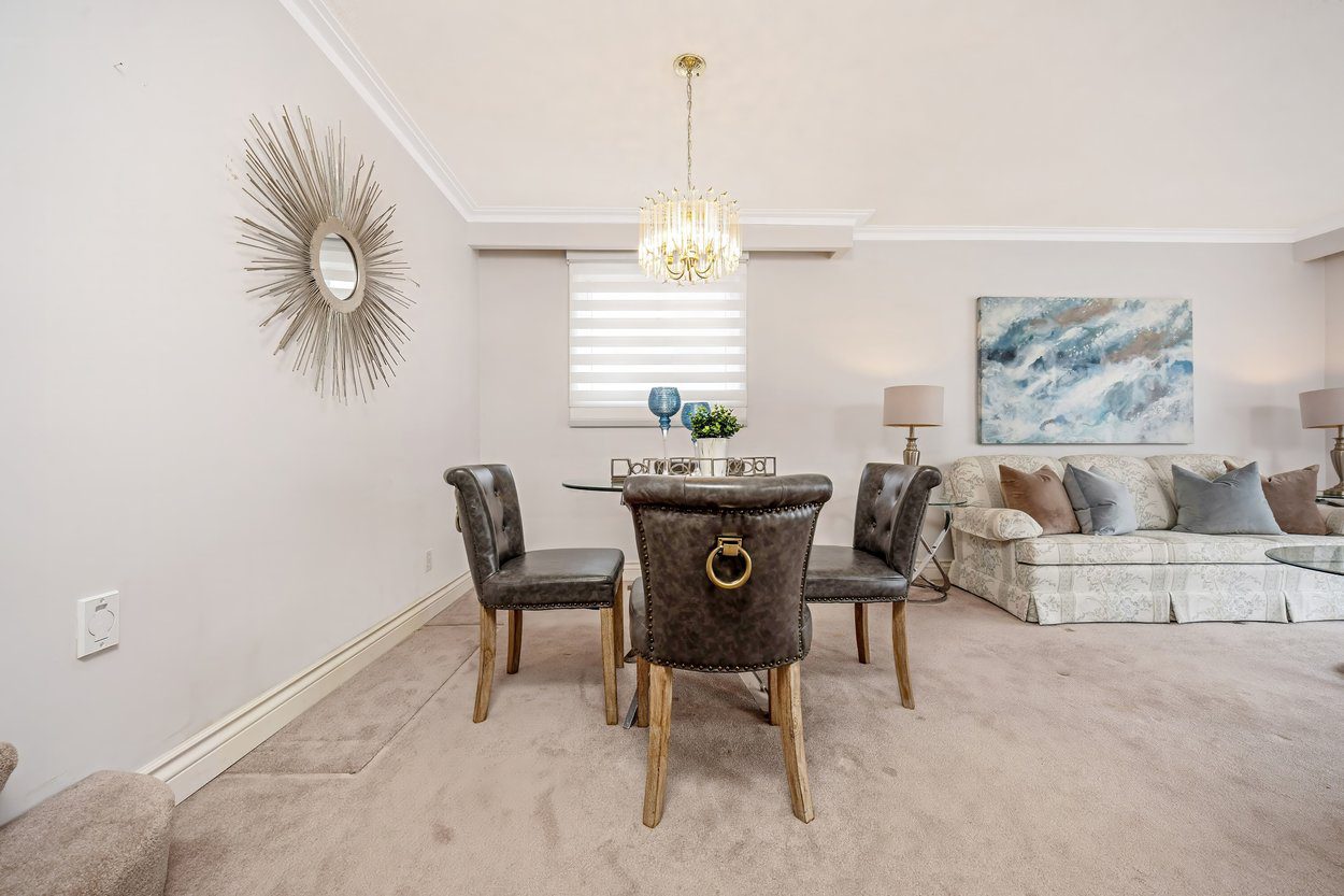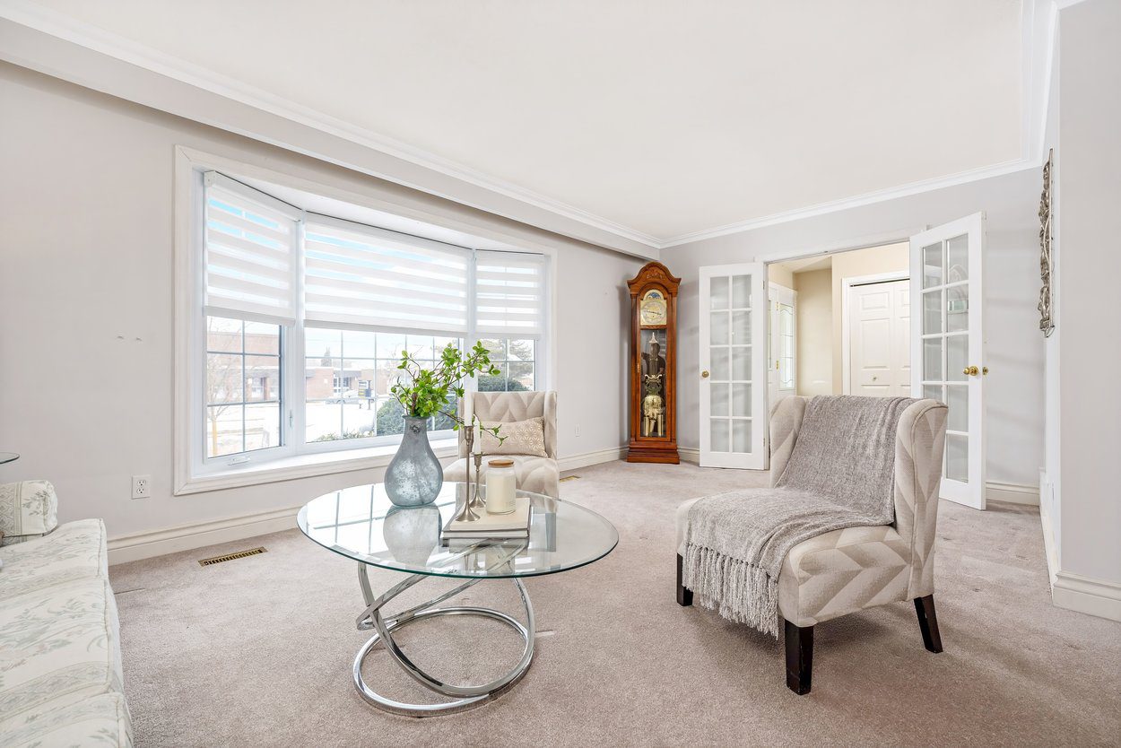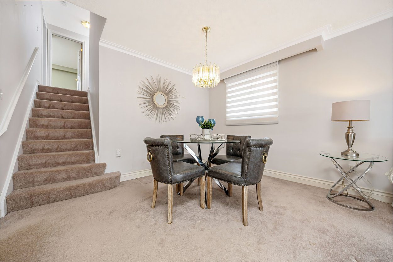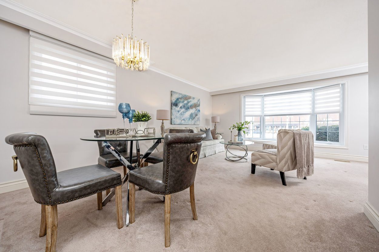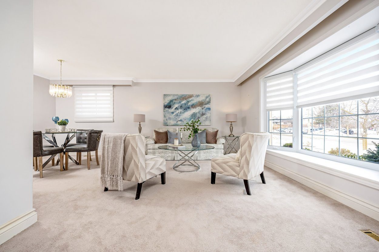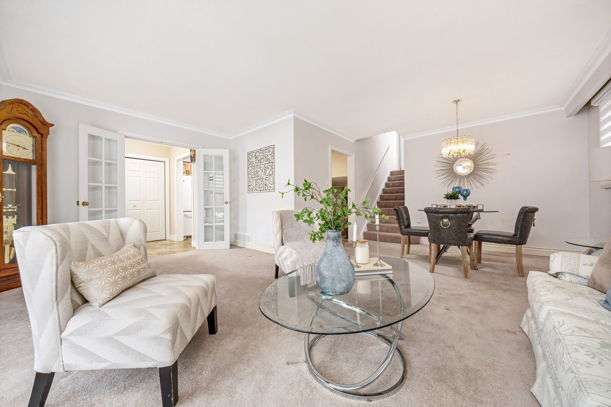 From the interlocking front steps and stone landing, you enter a welcoming foyer. French doors open into the bright living room, creating both separation and character. The living room features crown moulding and a bay window with built in seating bench, and flows directly into the dining room, making it ideal for everyday living and gatherings. Just beyond the dining room are the stairs leading to the upper level.