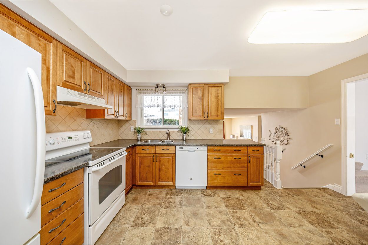 Straight ahead from the foyer is the kitchen, complete with GE white appliances, ceramic tile flooring, a Broan range hood and a window overlooking the backyard. From here, a short set of stairs leads down to the lower main level.