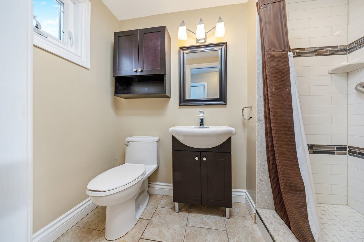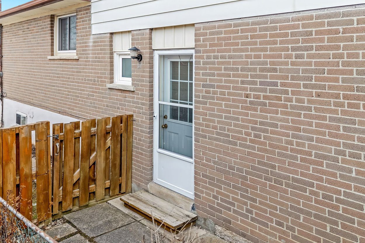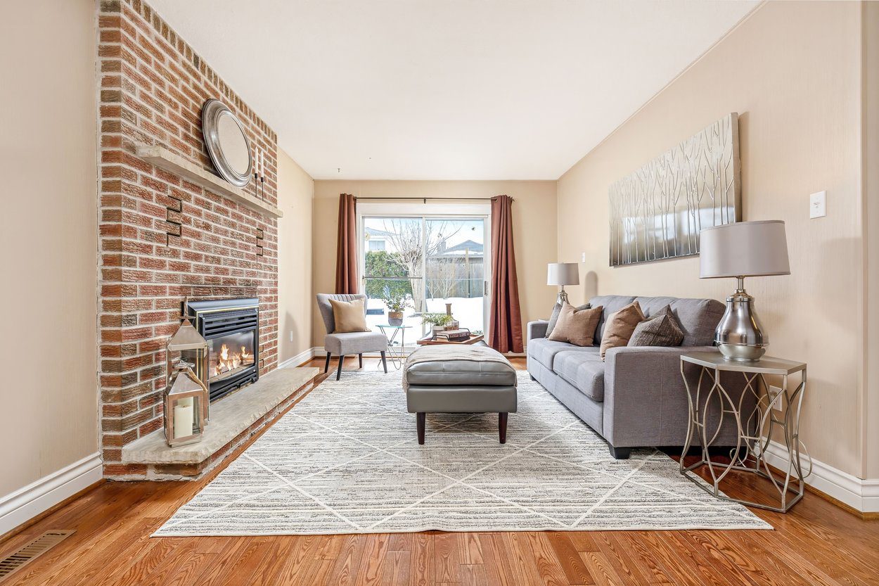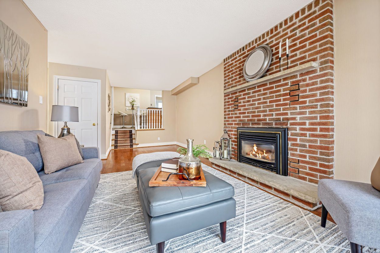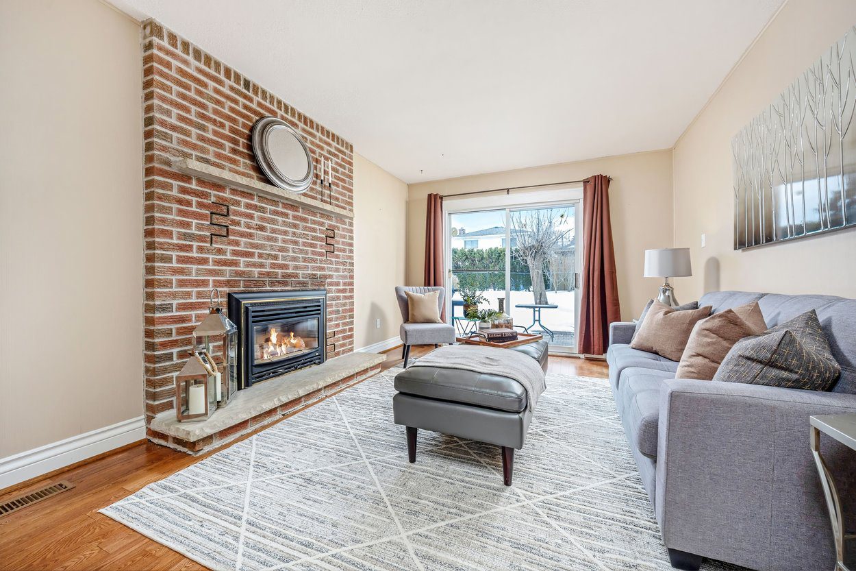 The lower level family room is warm and inviting with hardwood flooring and a gas fireplace featuring exposed brick surround and stone hearth. Sliding glass doors open to the interlocking patio and fully fenced backyard, while a side door provides additional access to the yard. This level also includes a fourth bedroom and a 3 piece bathroom with walk in shower, offering flexible use for guests, extended family or a home office. From this level, stairs lead down to the basement.