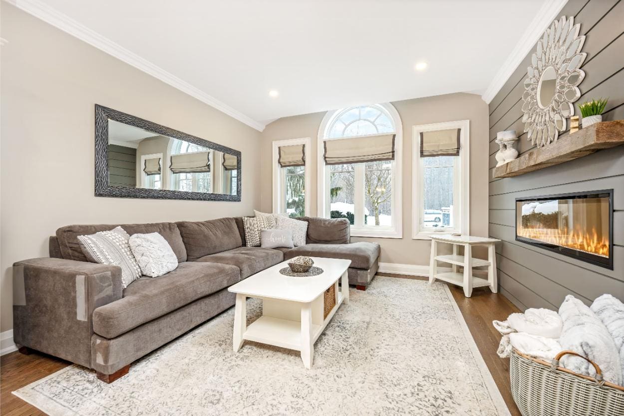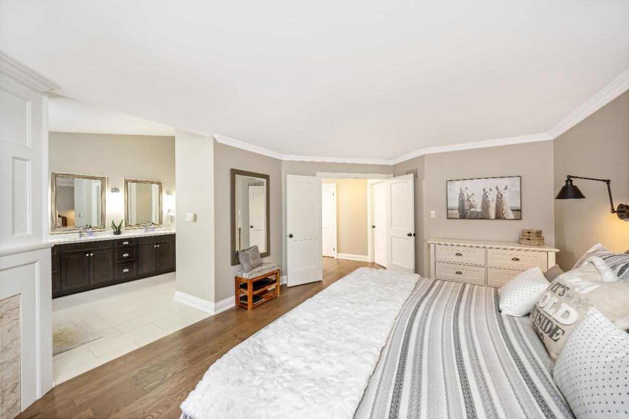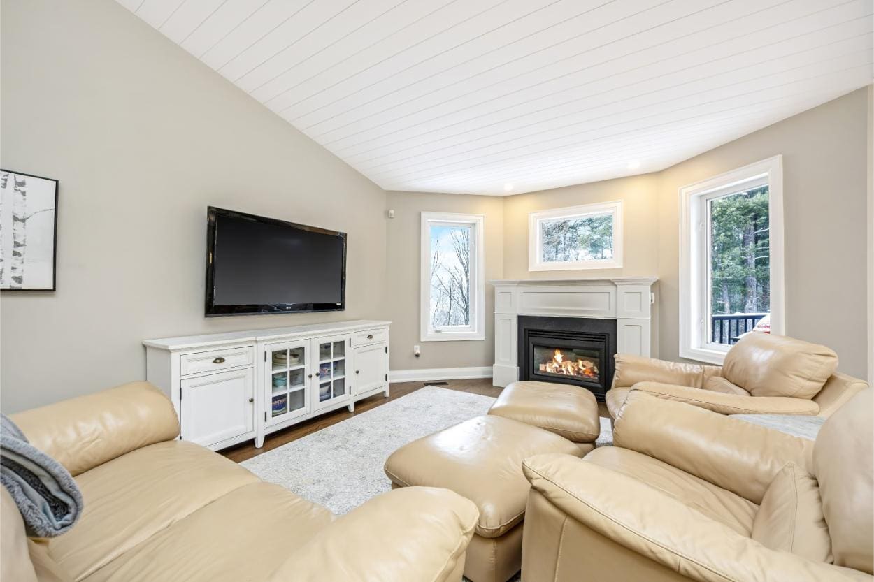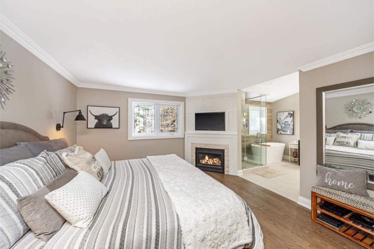 Open to the kitchen, the family room features vaulted shiplap ceilings, a gas fireplace, and large windows overlooking the ravine, creating a bright and comfortable gathering space. The primary bedroom retreat includes hardwood flooring, a walk in closet with built in shelving, and a gas fireplace. The spa inspired five piece ensuite offers a soaker tub, glass enclosed shower, and double vanity.