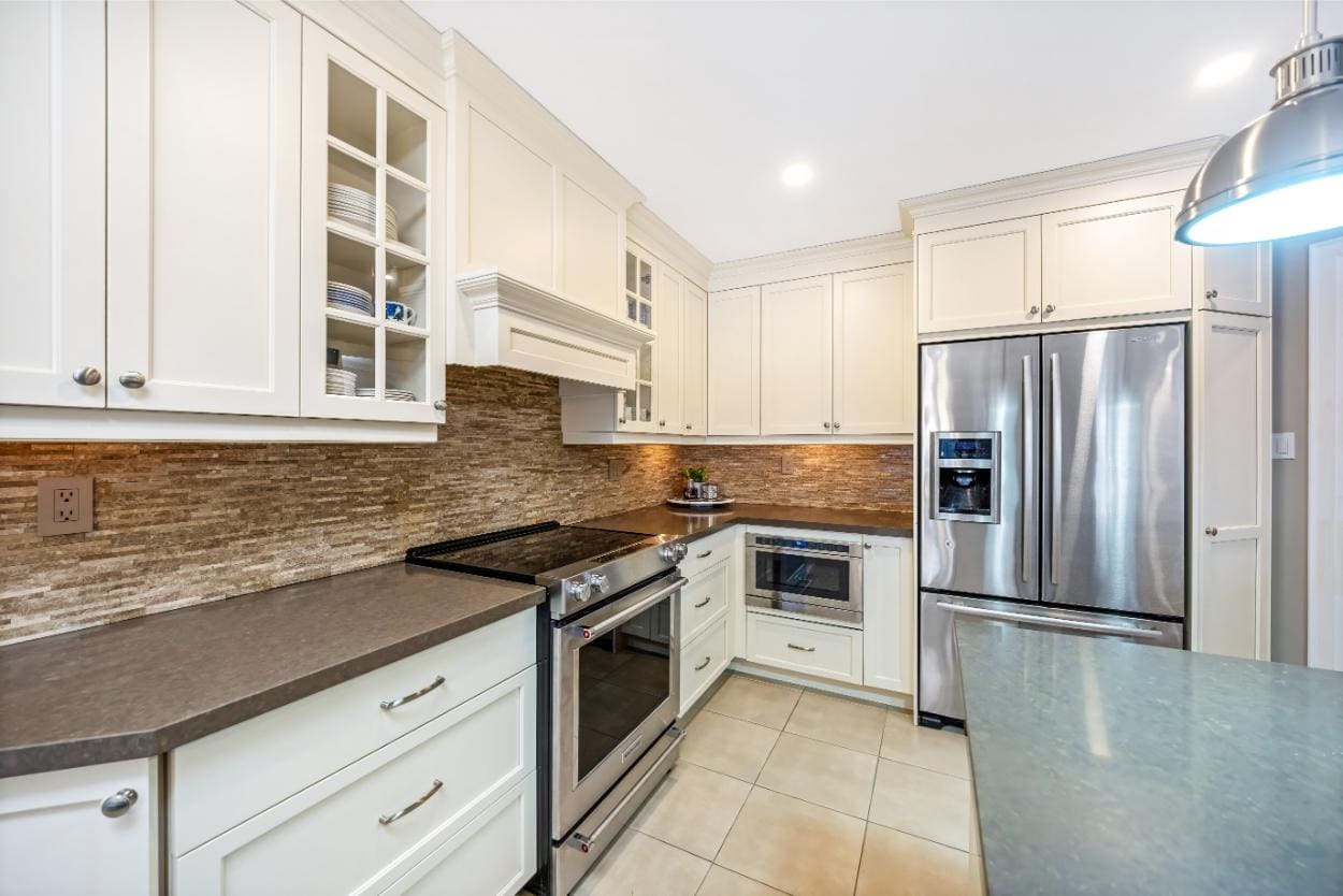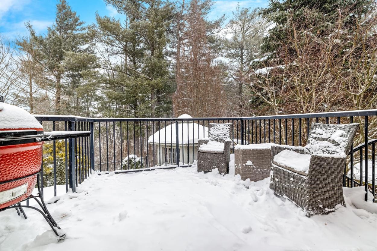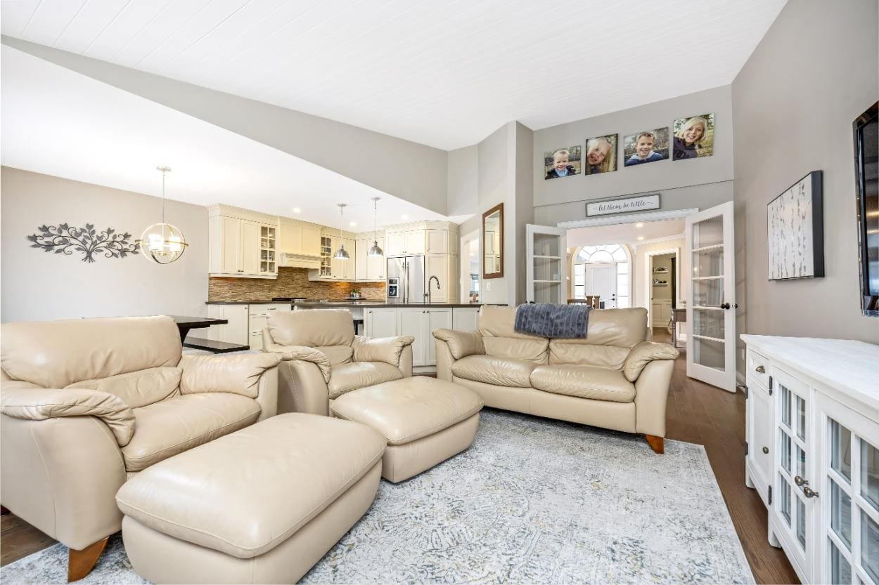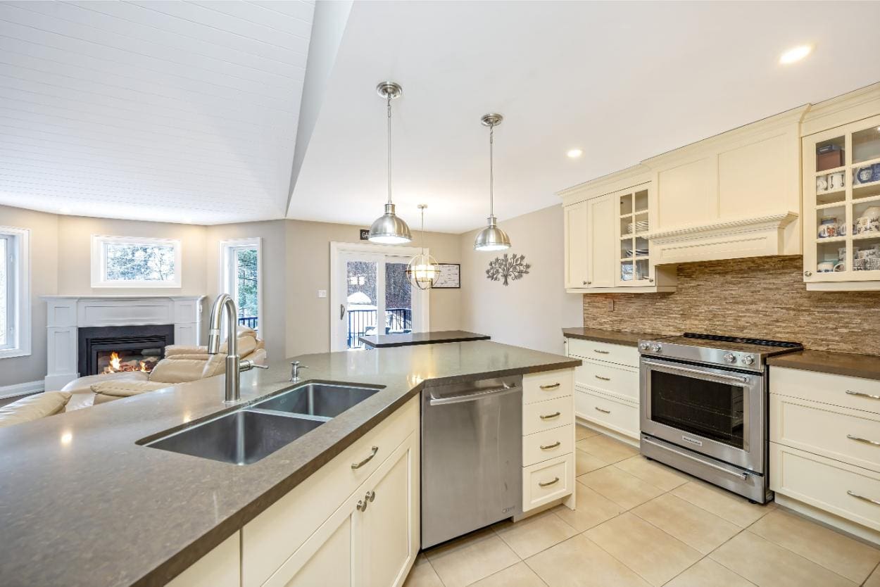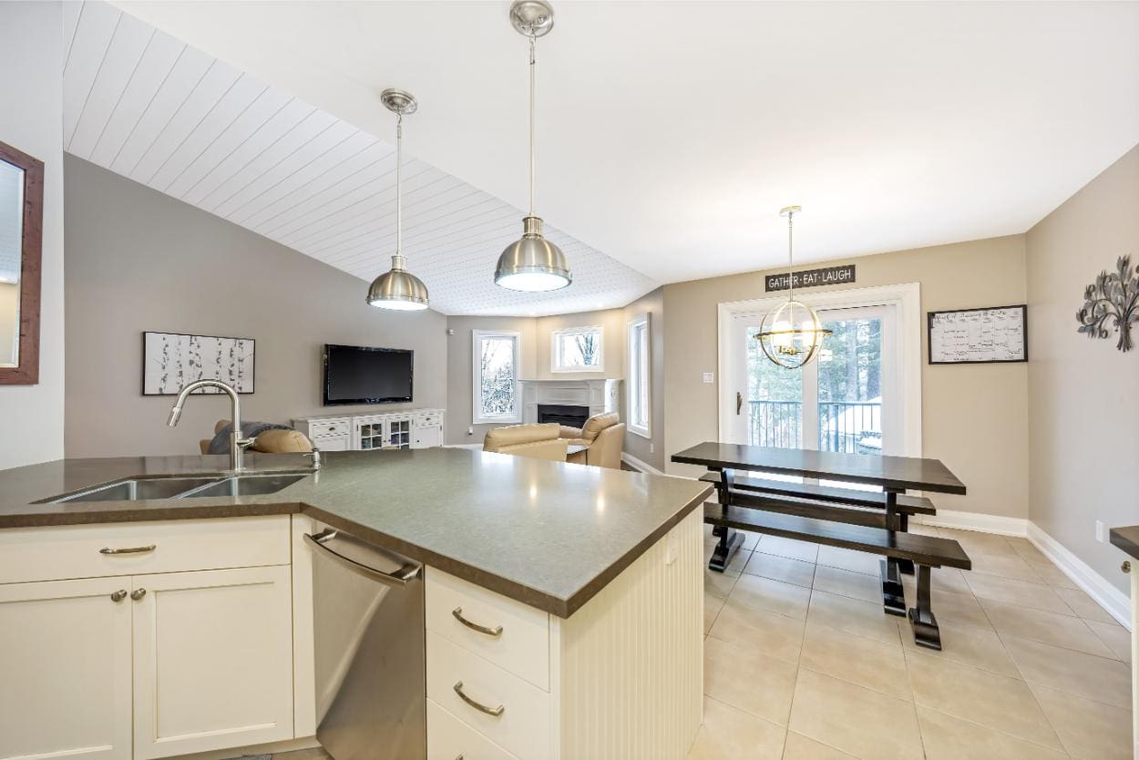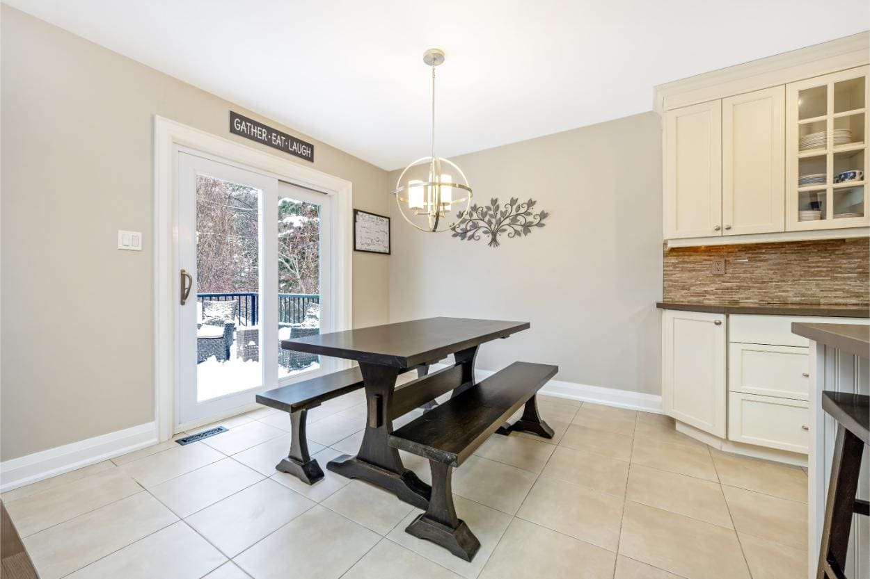 The living and dining areas are warm and inviting, finished with crown moulding, expansive windows, and a striking feature wall with an electric fireplace. The kitchen is thoughtfully designed with white shaker style cabinetry, quartz countertops, tile backsplash, and a large centre island with breakfast bar seating. Stainless steel appliances complete the space. The adjoining breakfast area walks out to a private upper deck with composite flooring, gas BBQ hookup, and a spiral staircase leading down to the pool area.