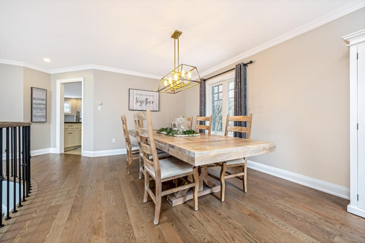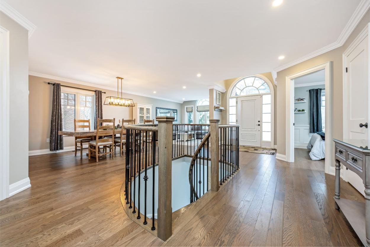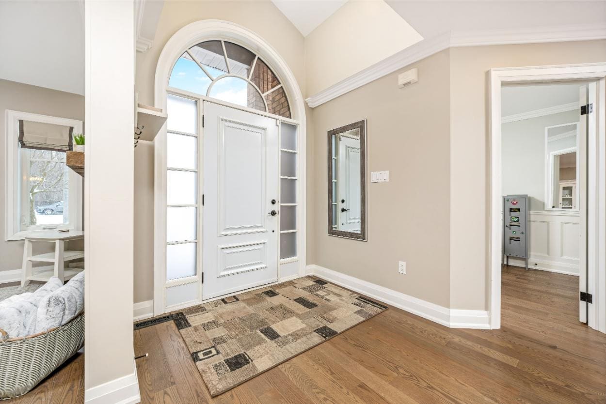 A landscaped front yard and stone walkway lead to a bright and welcoming foyer featuring soaring ceilings, an arched transom window, and full height sidelights. The main level offers hardwood flooring throughout and a seamless open concept layout designed for both daily living and entertaining.