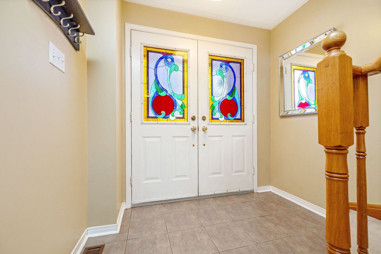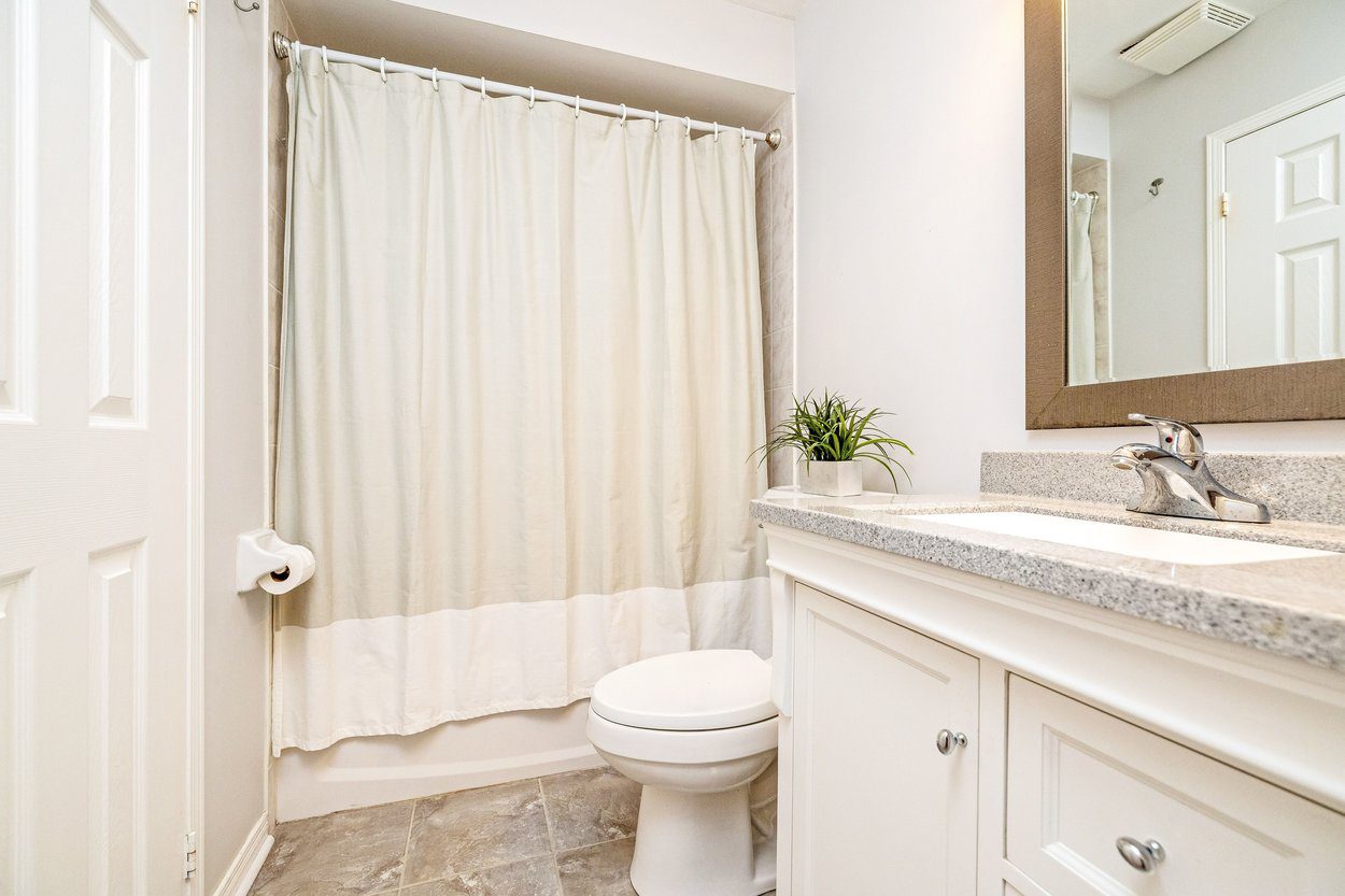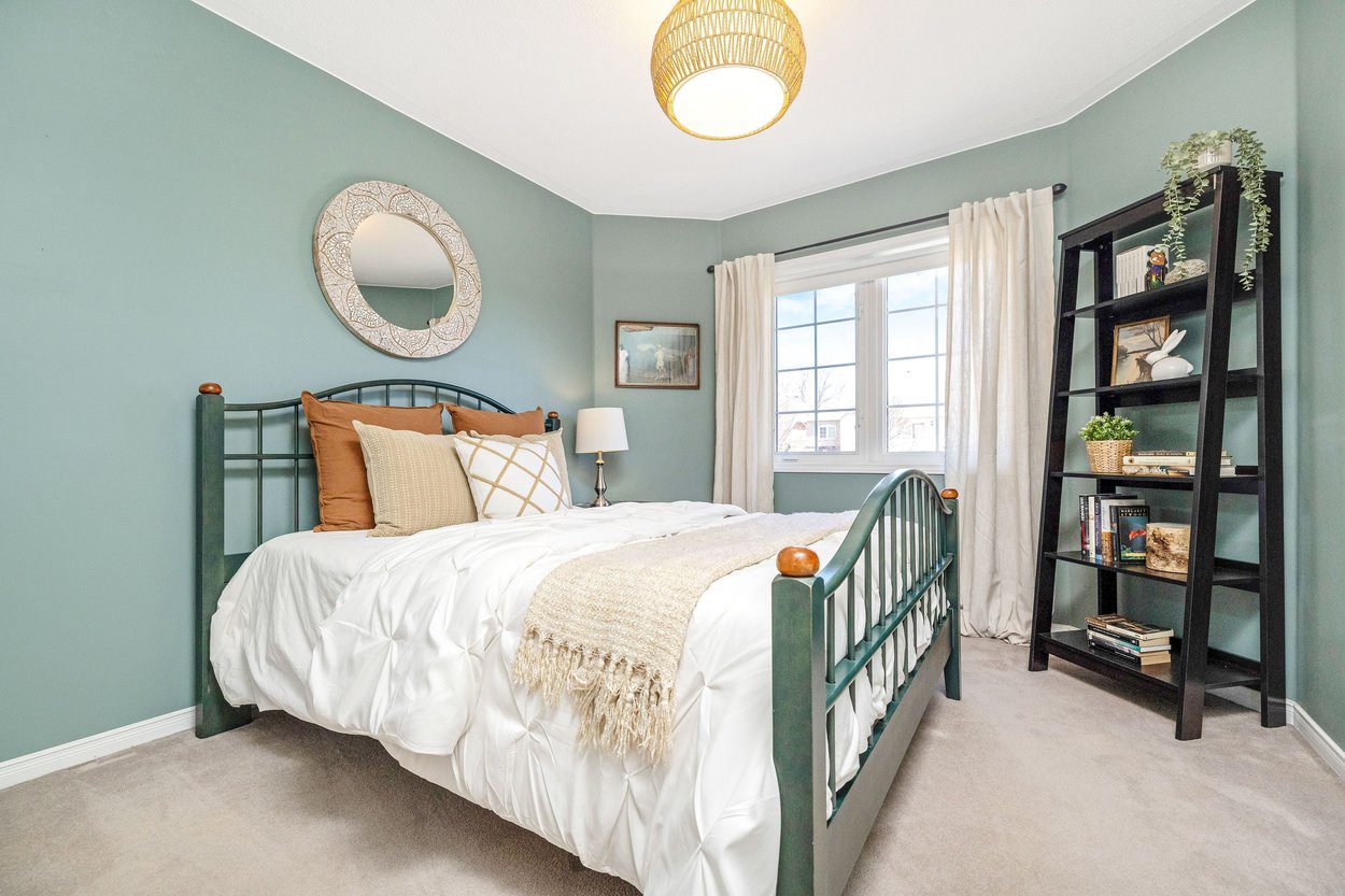 Upstairs, the home continues to offer a comfortable and well planned layout. The primary bedroom serves as a peaceful retreat, featuring two windows overlooking the backyard, a stylish chandelier, and two double closets that provide excellent storage. The semi-ensuite bathroom is thoughtfully designed with a tub and shower combination, built-in vanity, and dual access from both the primary bedroom and the hallway, adding both convenience and functionality. A second bedroom with front yard views, broadloom flooring, and a double closet offers flexibility for guests, family, or a home office setup.