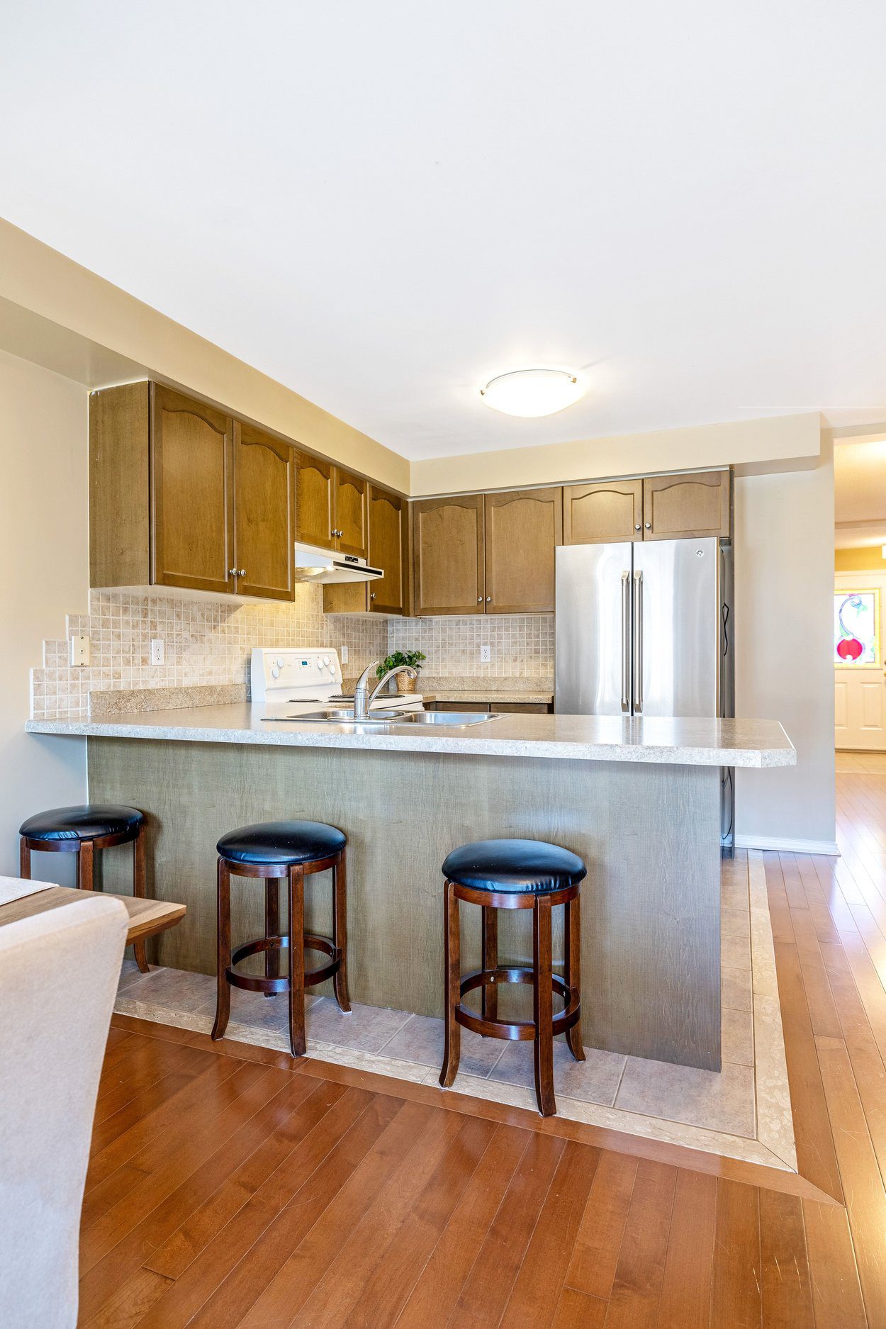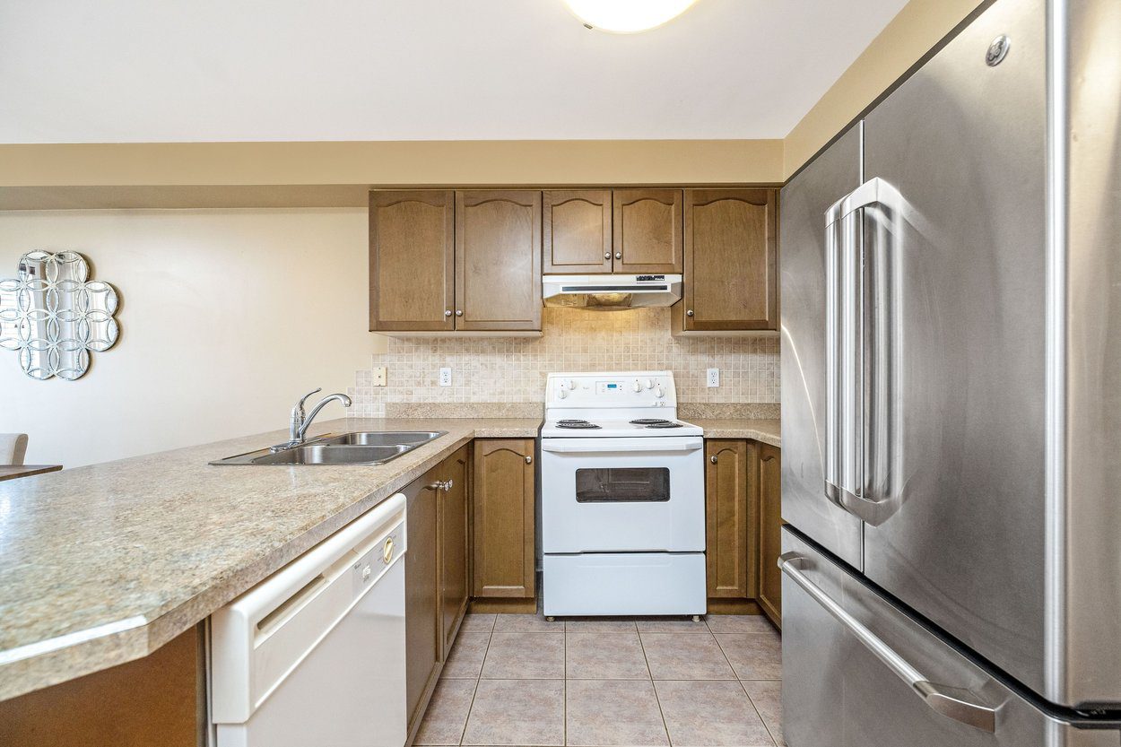 The open concept layout allows for a comfortable flow between the living and dining areas, making it easy to host or simply enjoy quiet time at home. The kitchen is both practical and inviting, featuring warm brown cabinetry with curved panel detailing, a tile backsplash with multiple outlets, and a full suite of appliances. A functional breakfast bar offers additional seating, creating a natural gathering space for casual meals, morning coffee, or conversation.