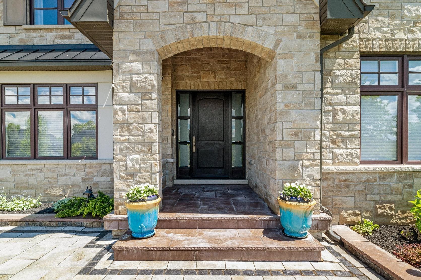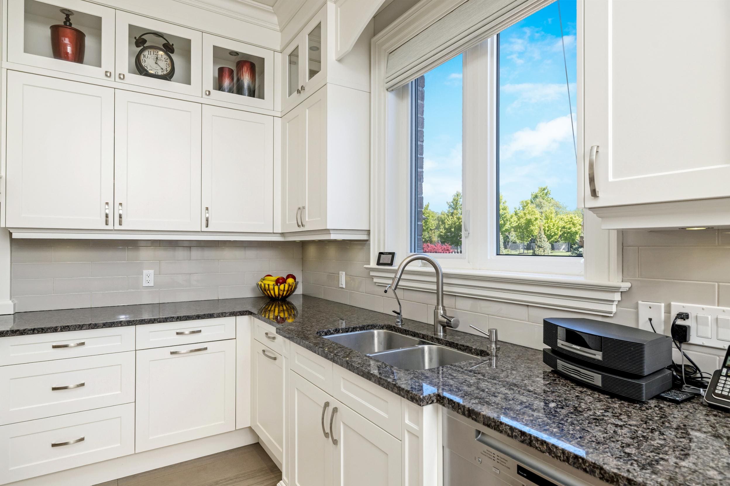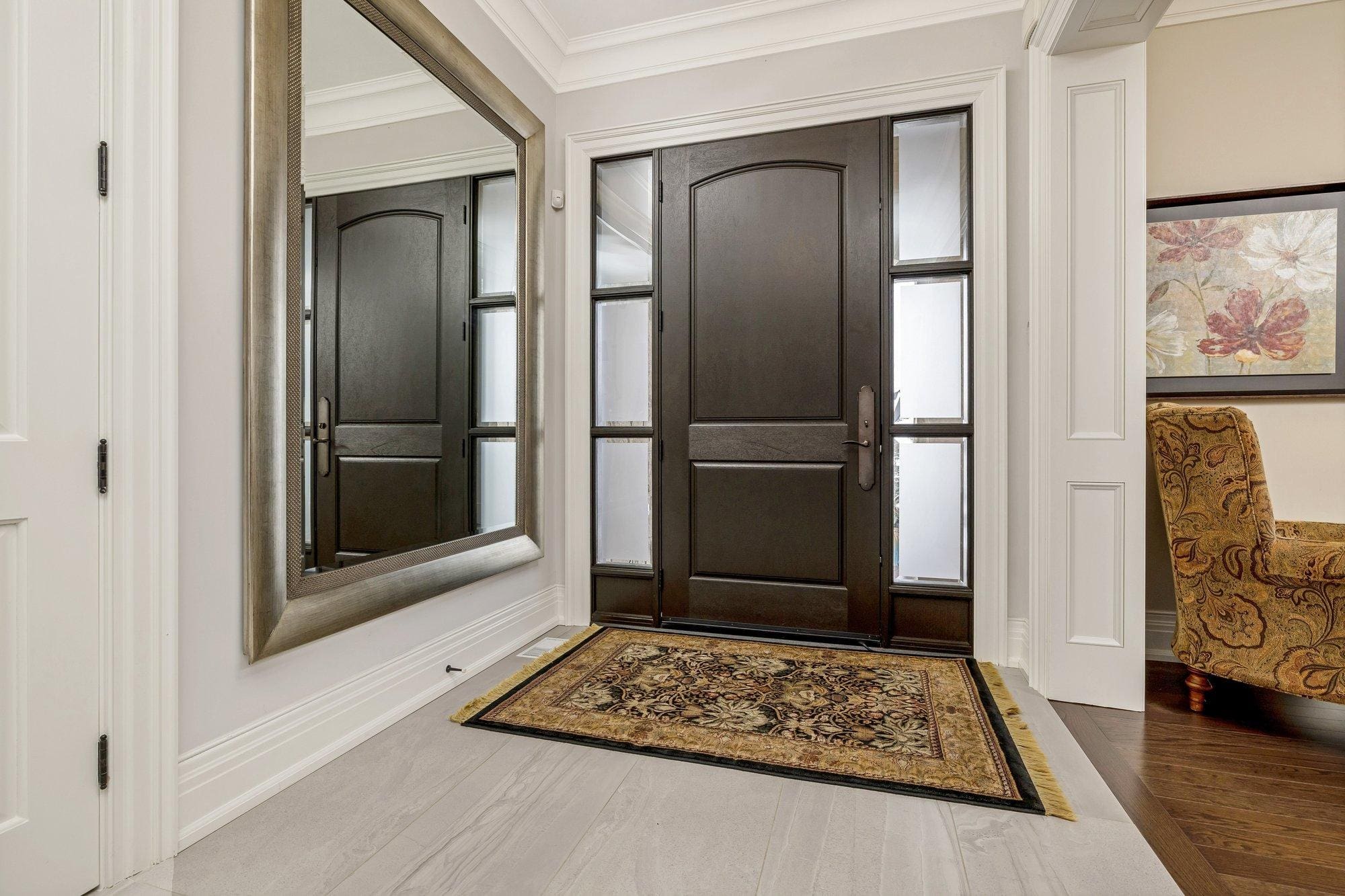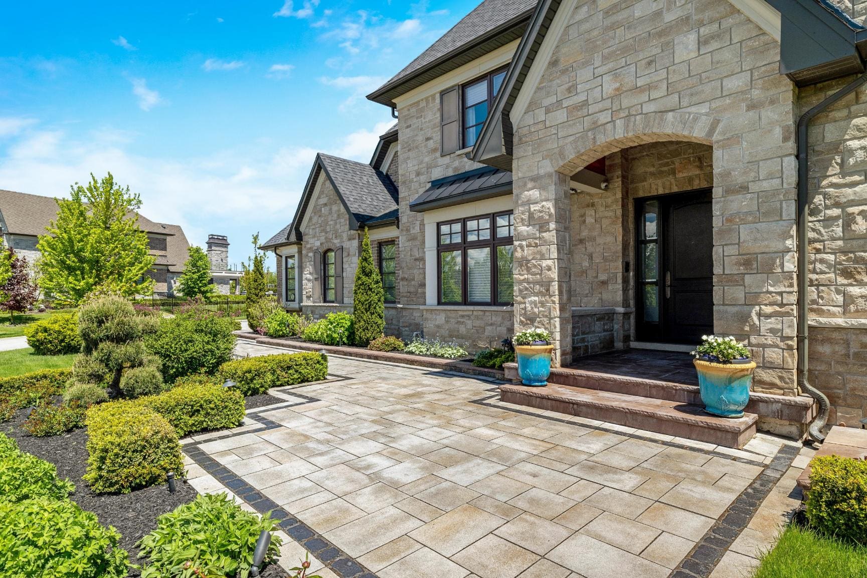 Inside, the home is defined by its scale and craftsmanship. Soaring 10 ft ceilings on the main level and 9 ft ceilings above and below create an open, airy atmosphere, while hardwood flooring, stone surfaces, custom cabinetry, and tall baseboards reflect the attention to detail carried throughout.