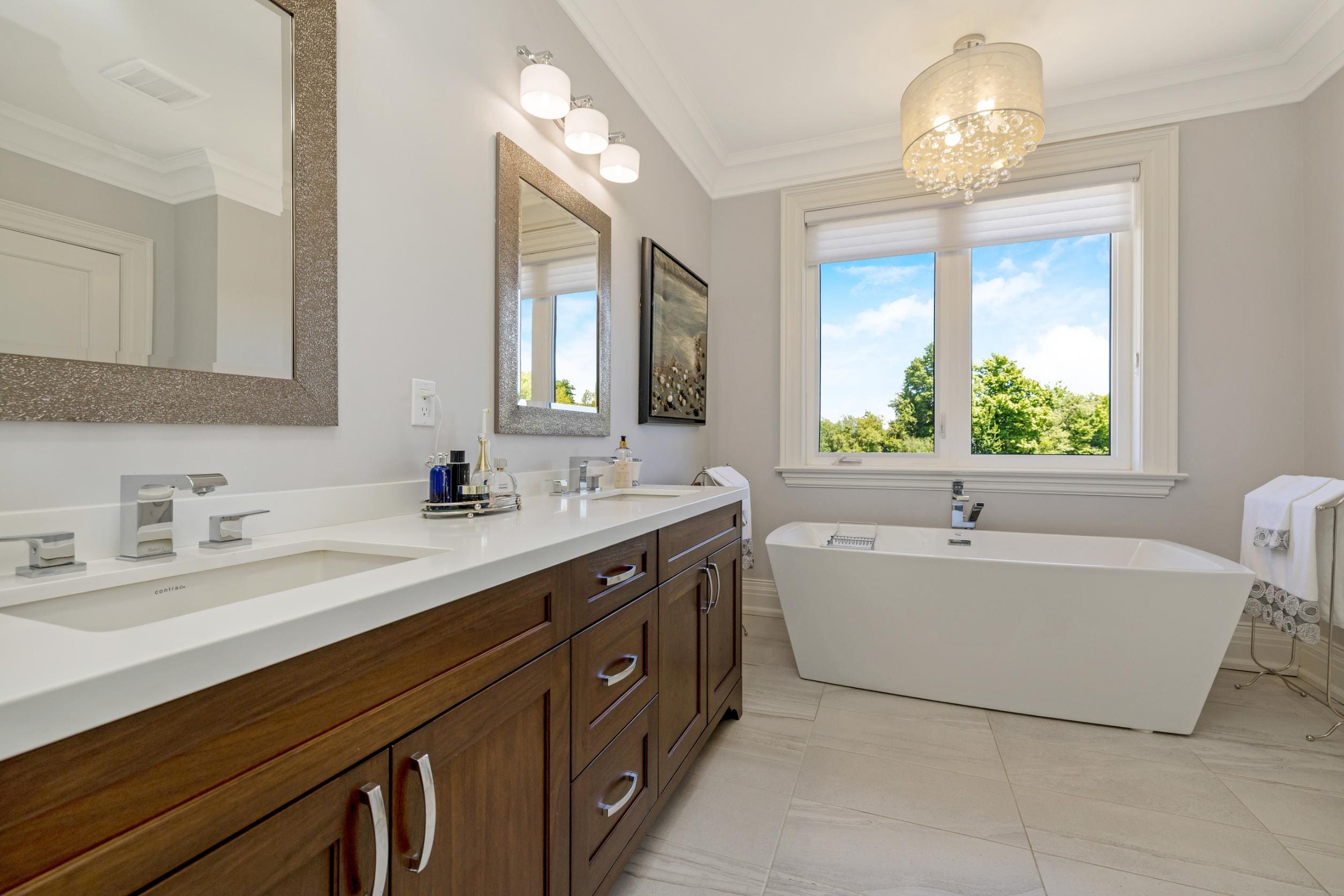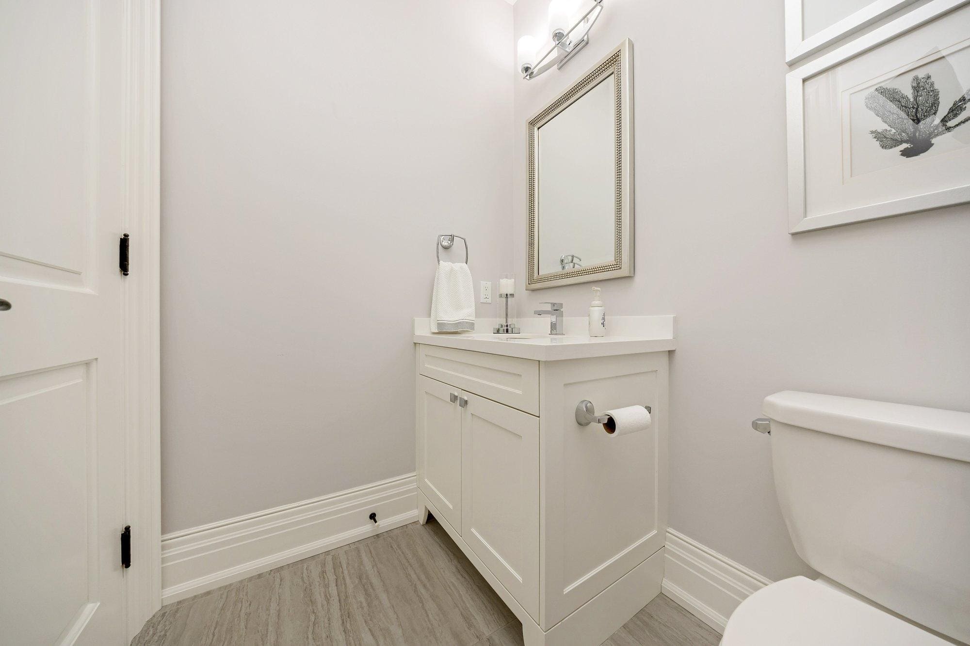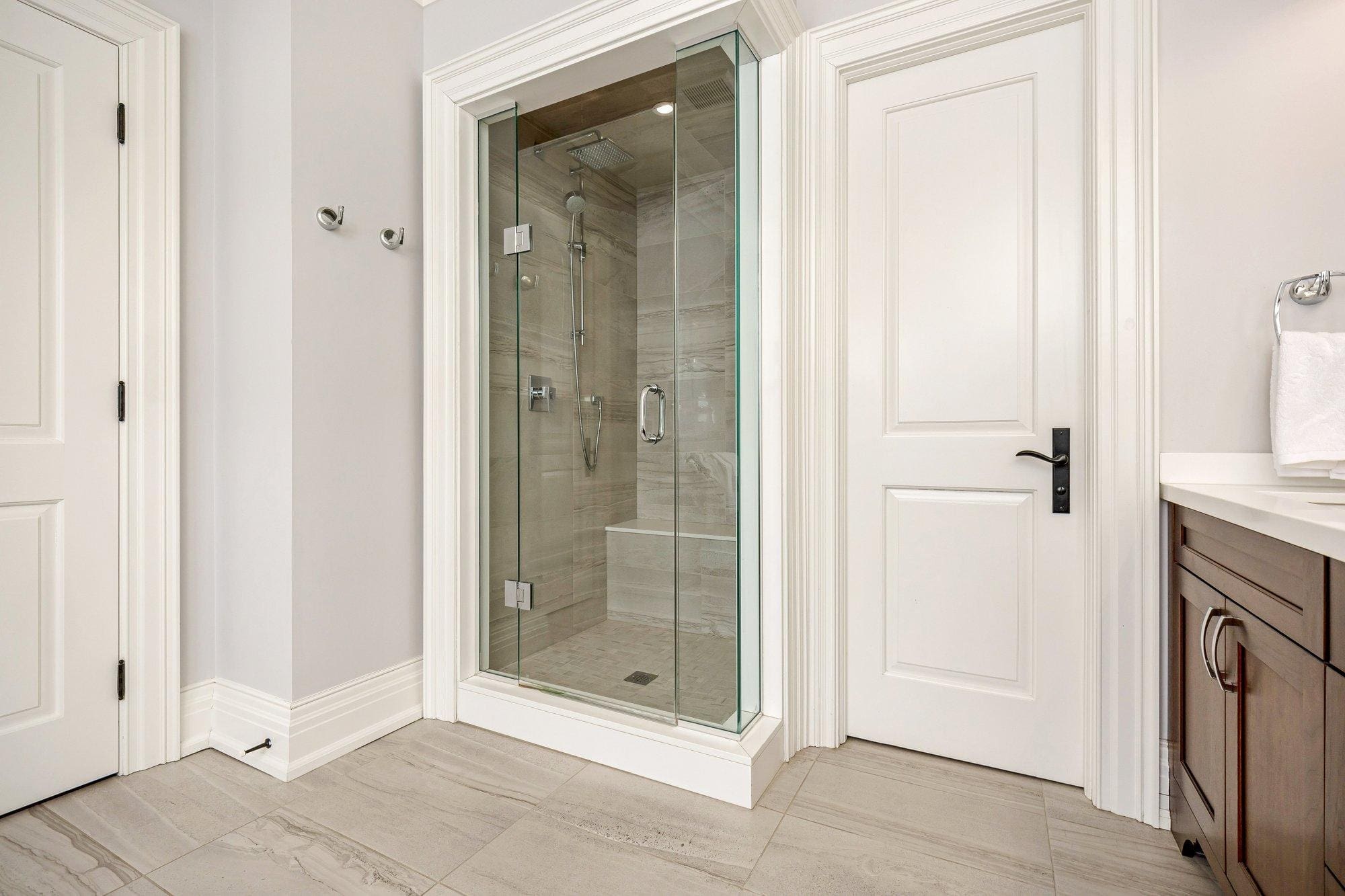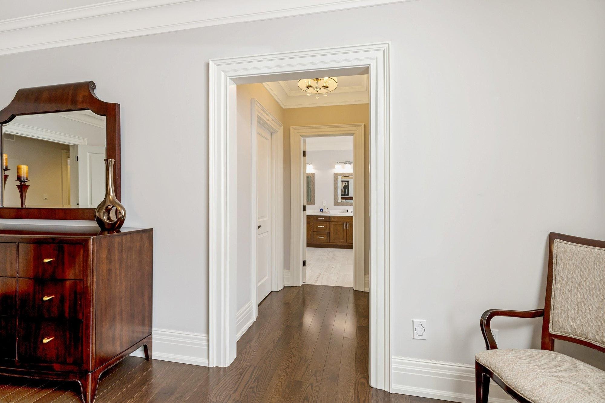 Inside, the home is defined by its scale and craftsmanship. Soaring 10 ft ceilings on the main level and 9 ft ceilings above and below create an open, airy atmosphere, while hardwood flooring, stone surfaces, custom cabinetry, and tall baseboards reflect the attention to detail carried throughout.