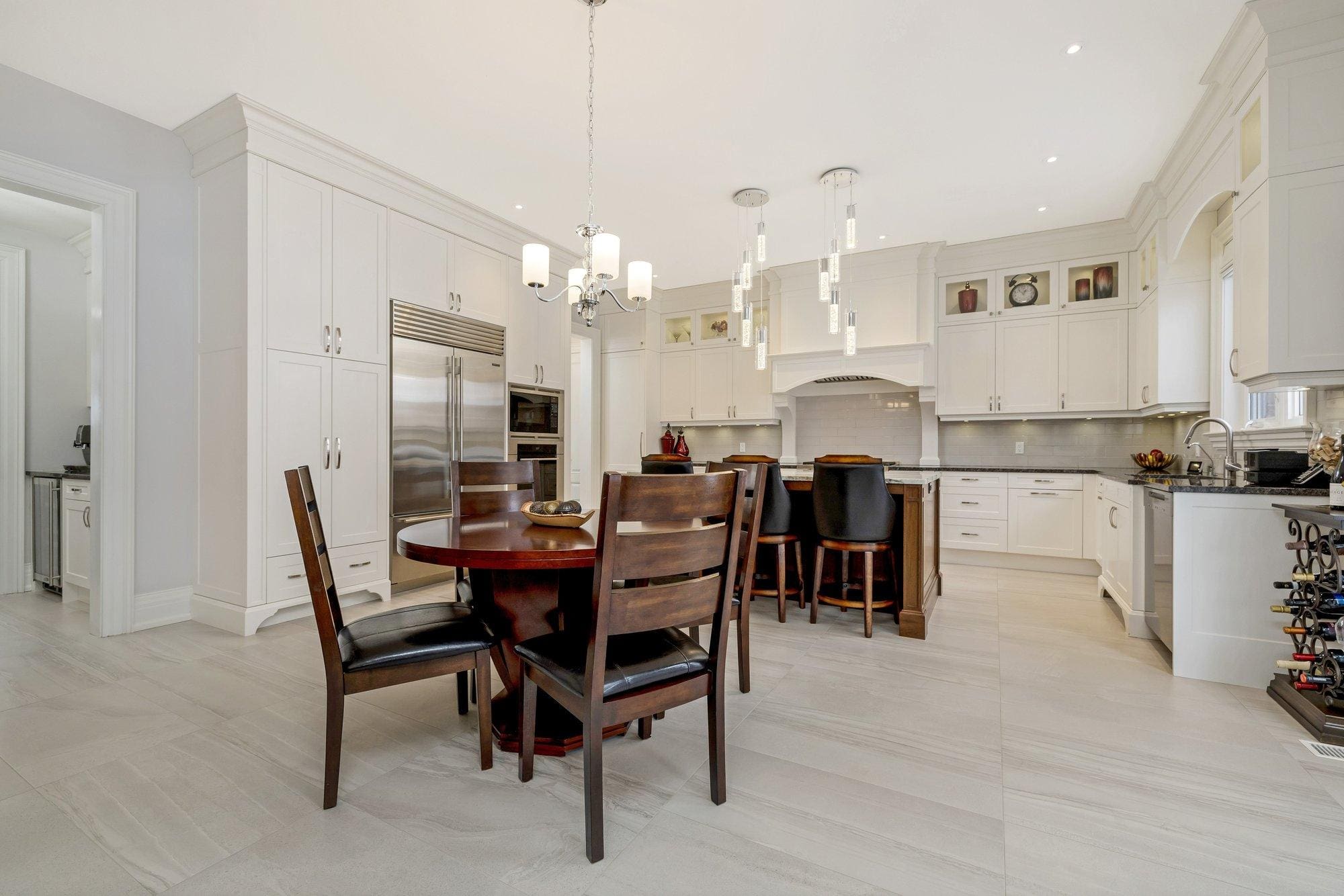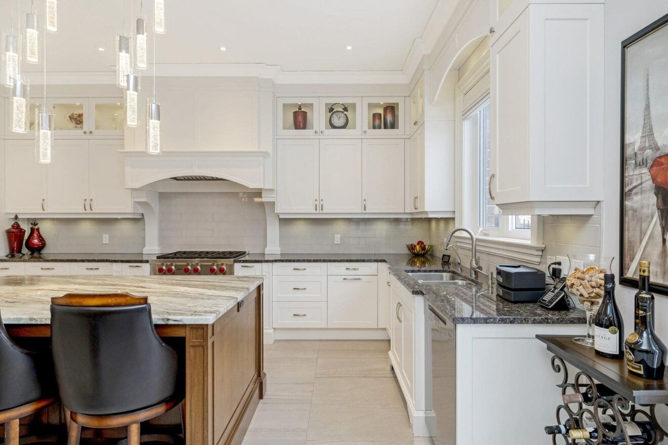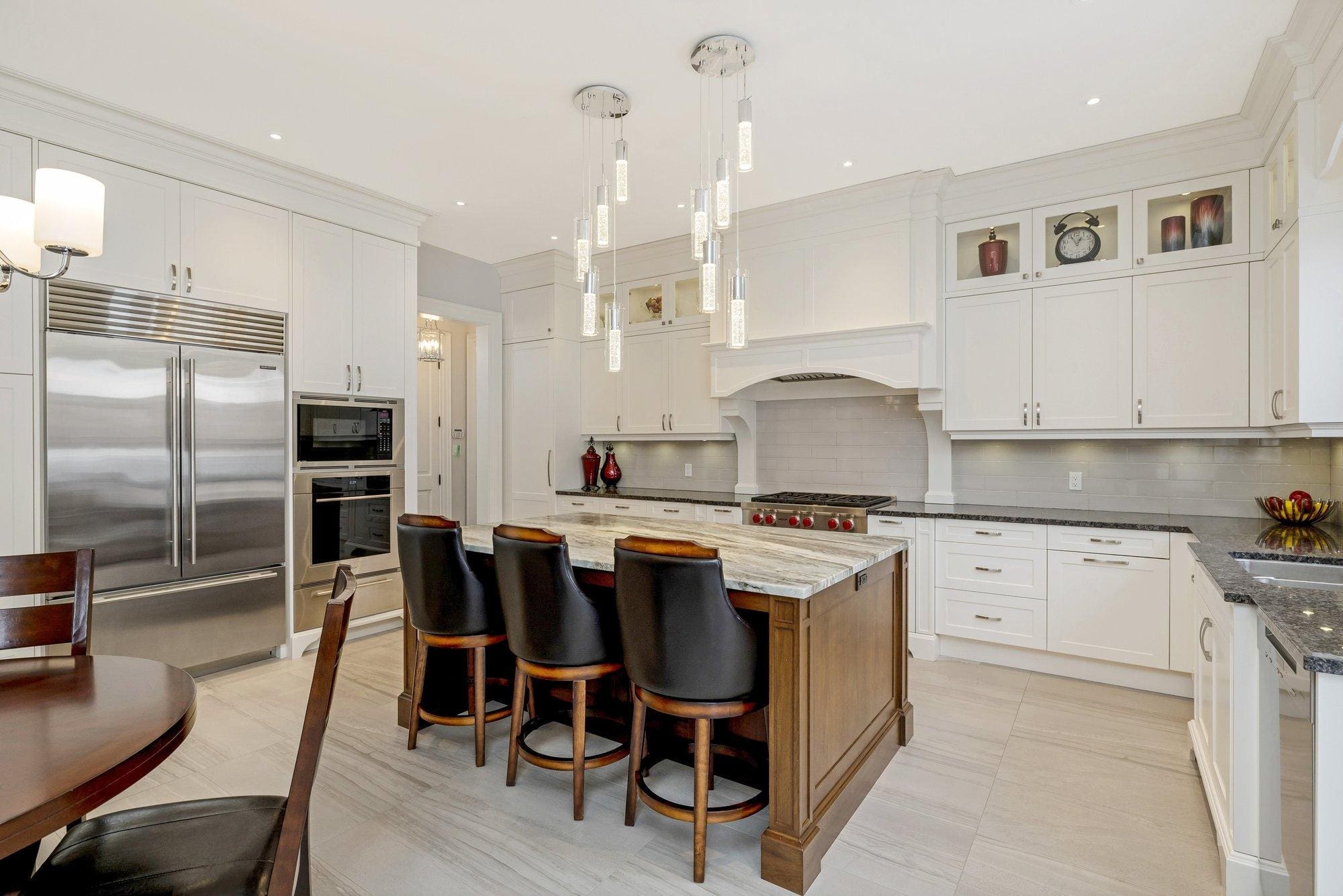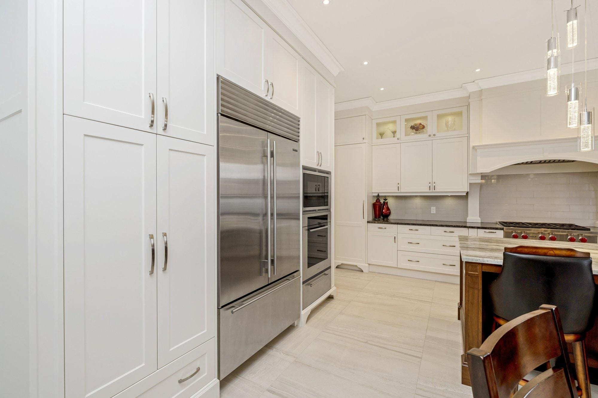 The main level is thoughtfully designed for both everyday living and entertaining. A private study offers a quiet space to work from home, while the formal dining room connects to the kitchen through a walk-through servery, making hosting effortless. At the heart of the home, the chef’s kitchen is both beautiful and highly functional, featuring Wolf appliances, a Subzero refrigerator, Miele dishwasher, and custom cabinetry with integrated storage solutions.