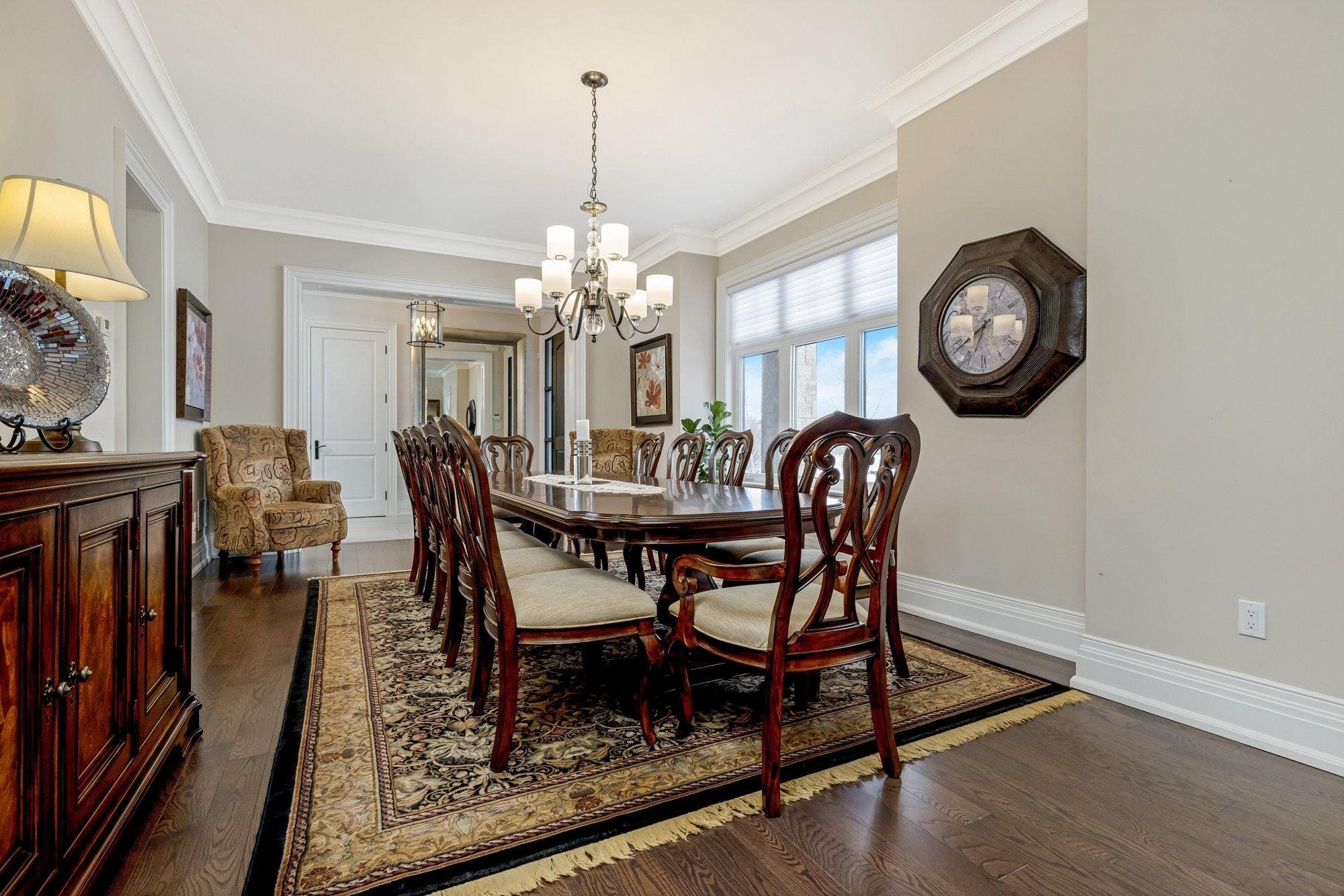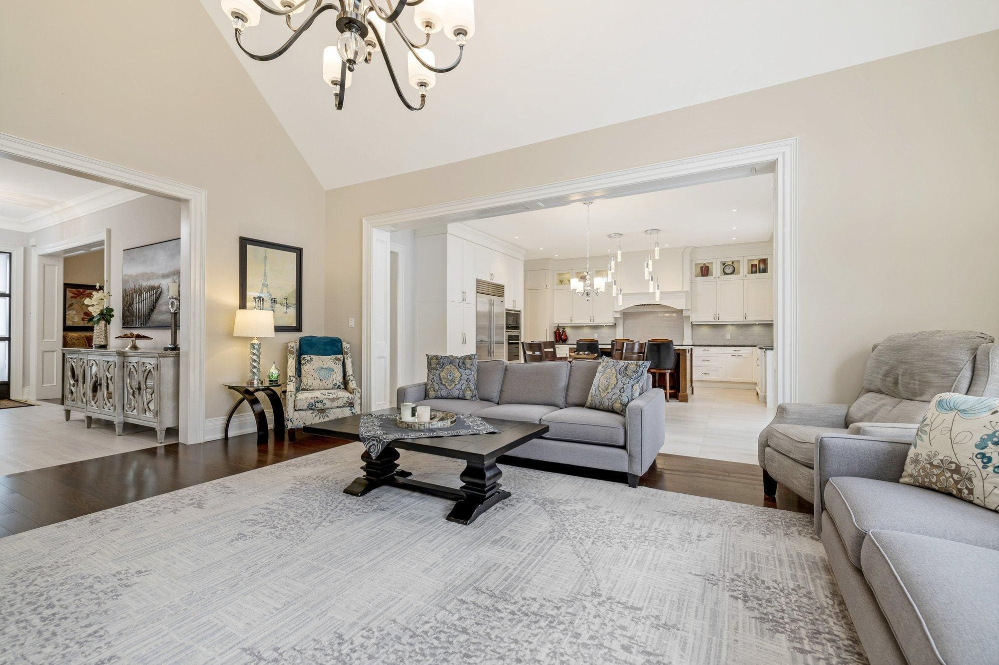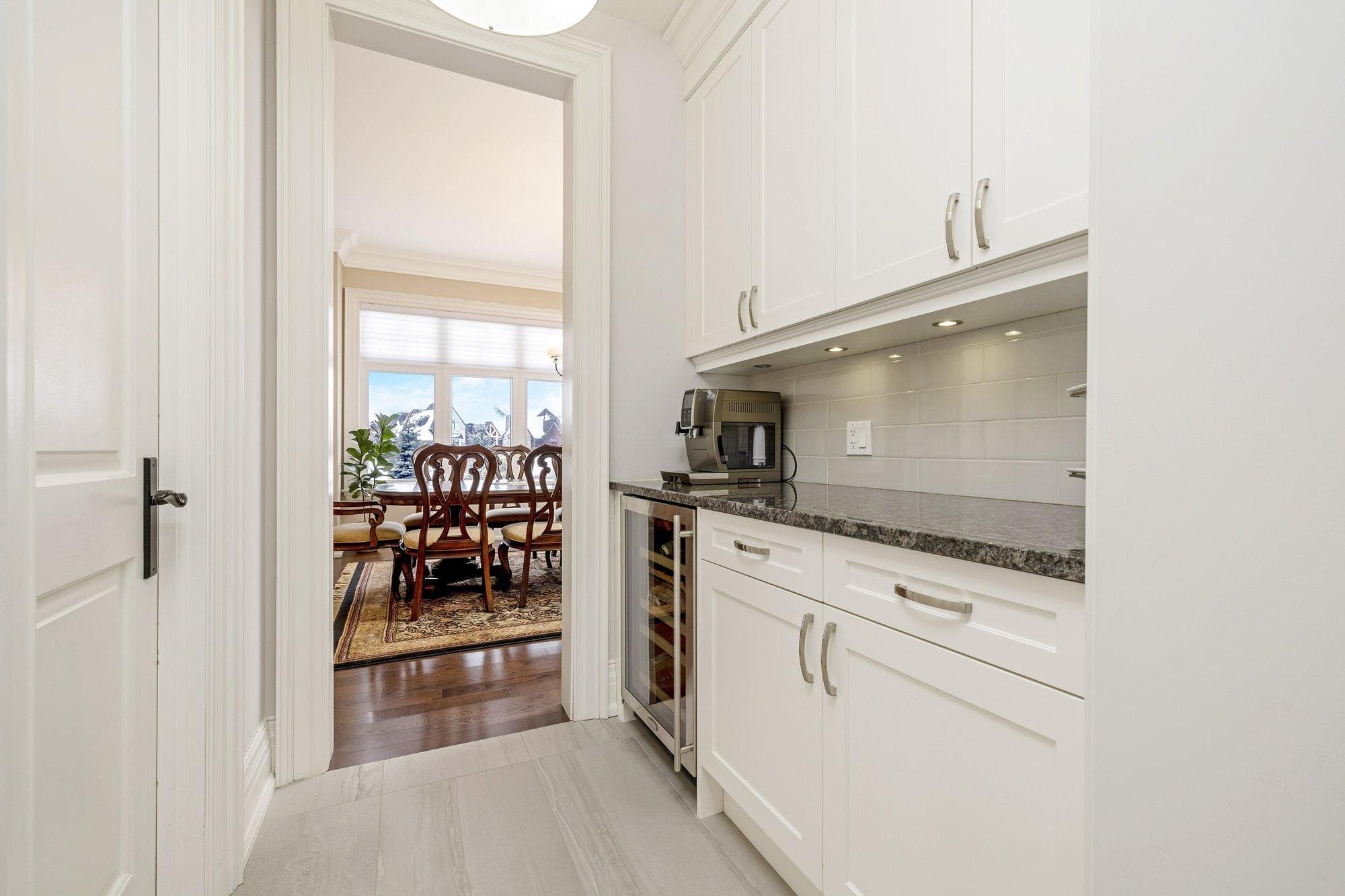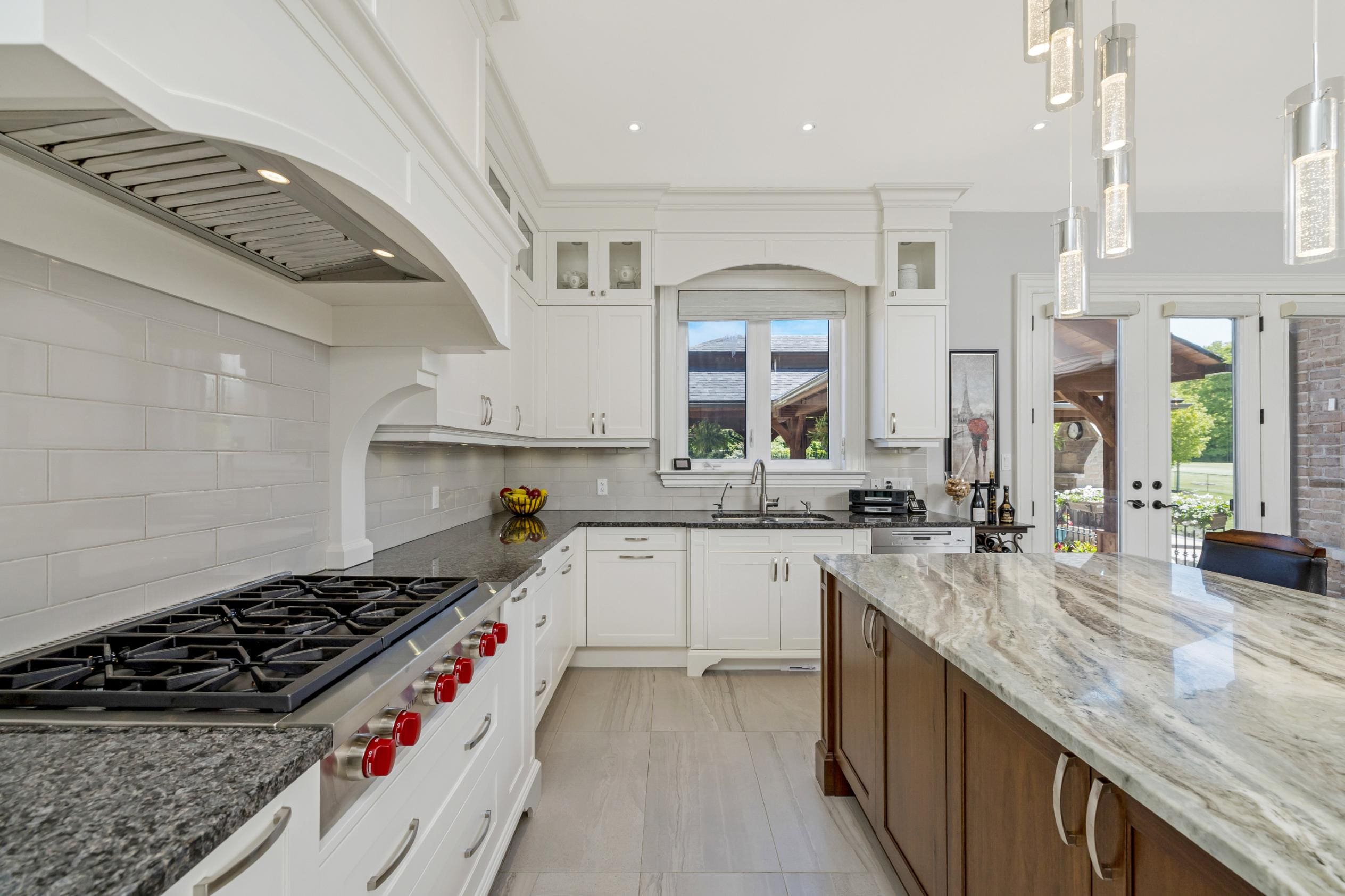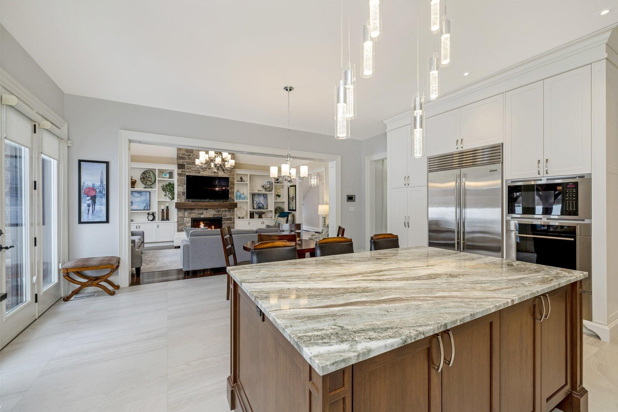 The main level is thoughtfully designed for both everyday living and entertaining. A private study offers a quiet space to work from home, while the formal dining room connects to the kitchen through a walk-through servery, making hosting effortless. At the heart of the home, the chef’s kitchen is both beautiful and highly functional, featuring Wolf appliances, a Subzero refrigerator, Miele dishwasher, and custom cabinetry with integrated storage solutions.
