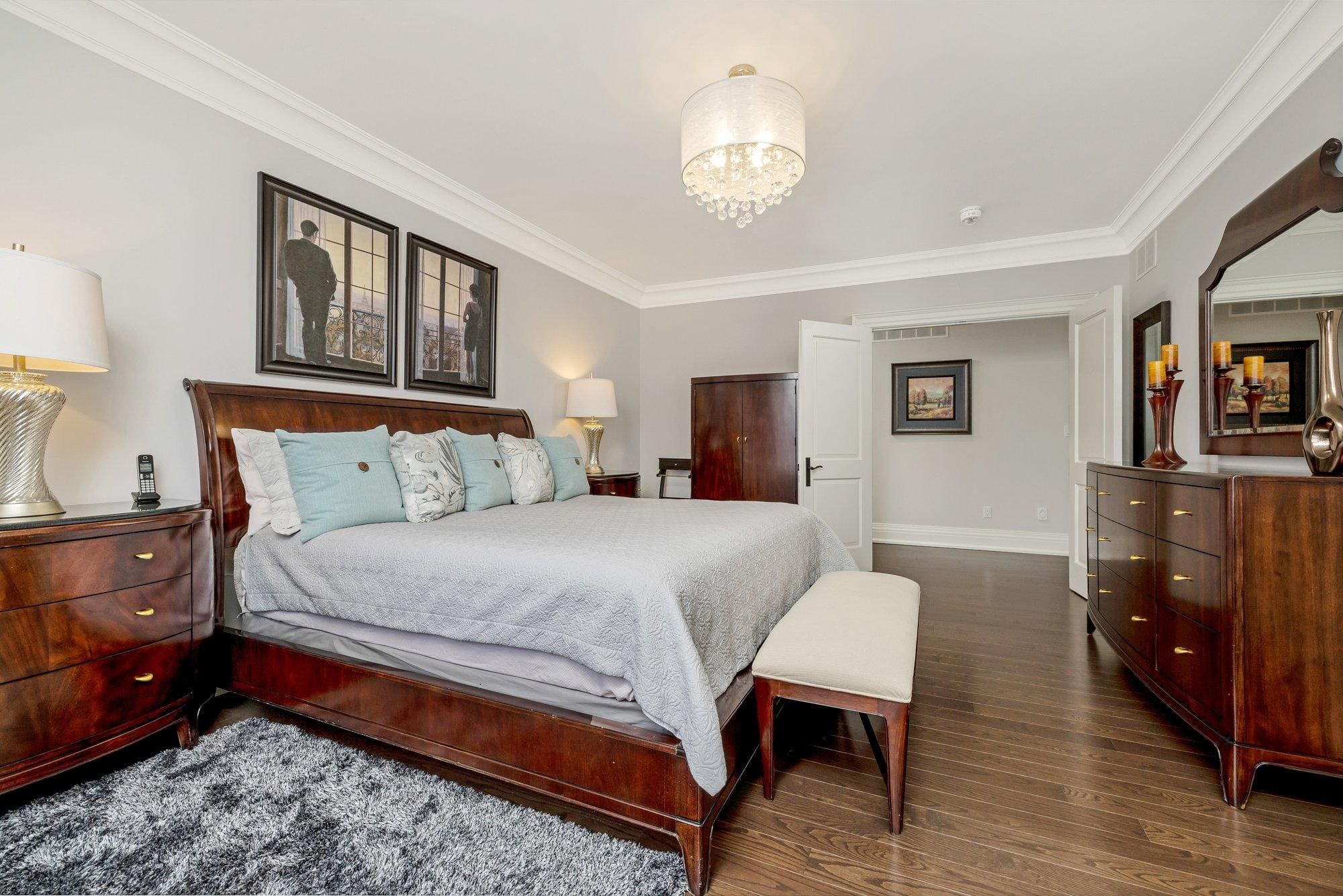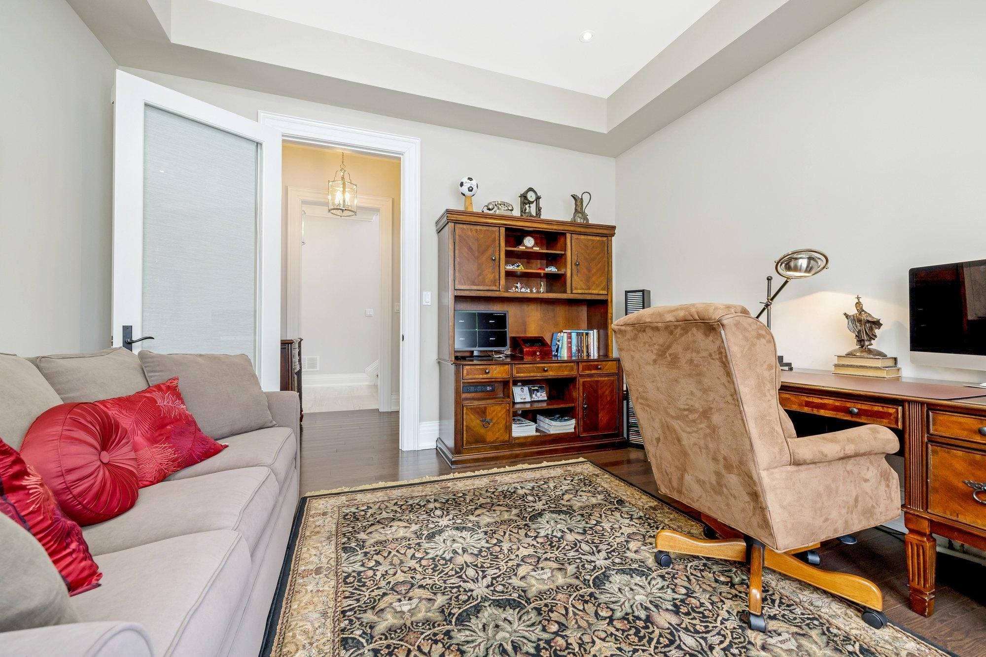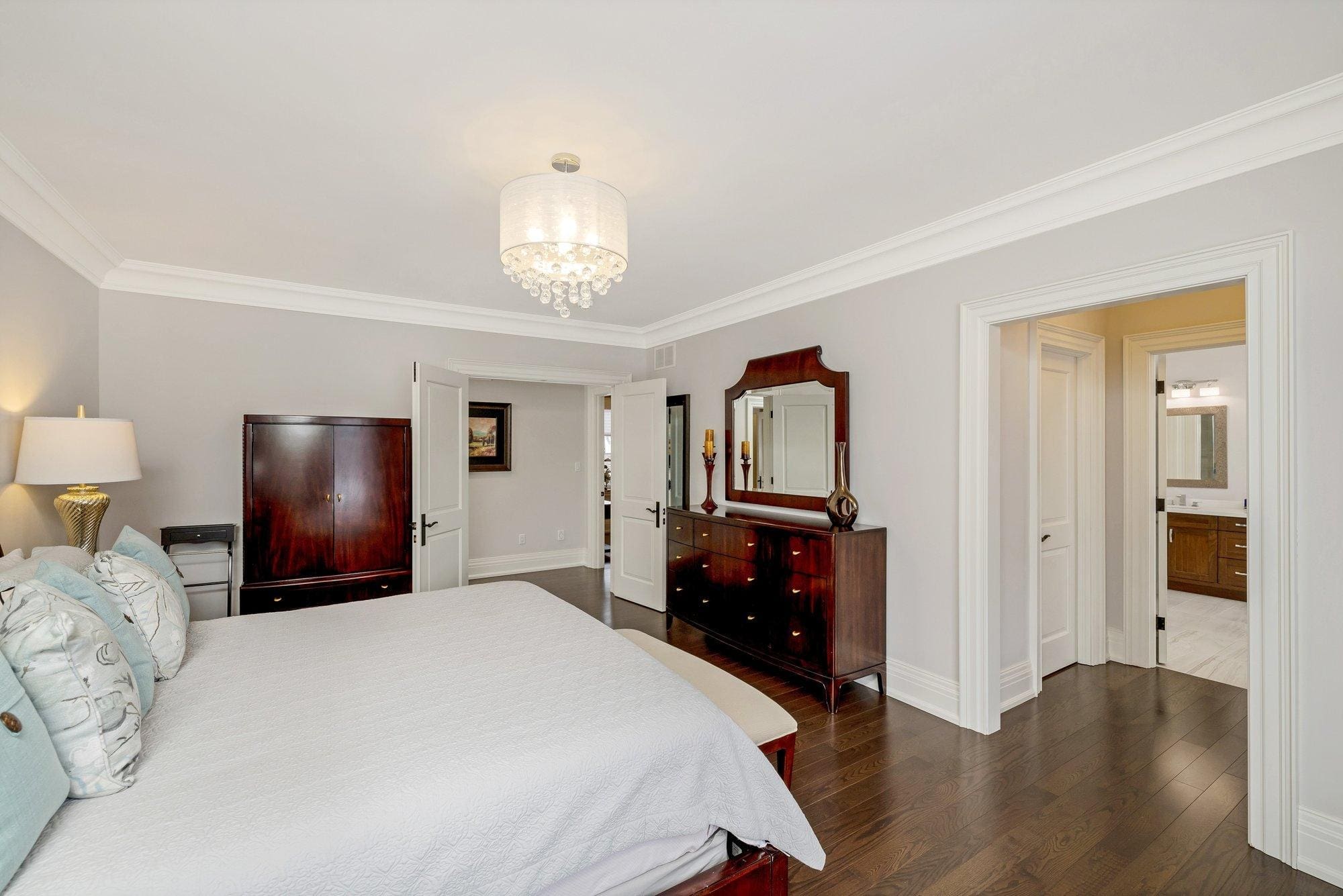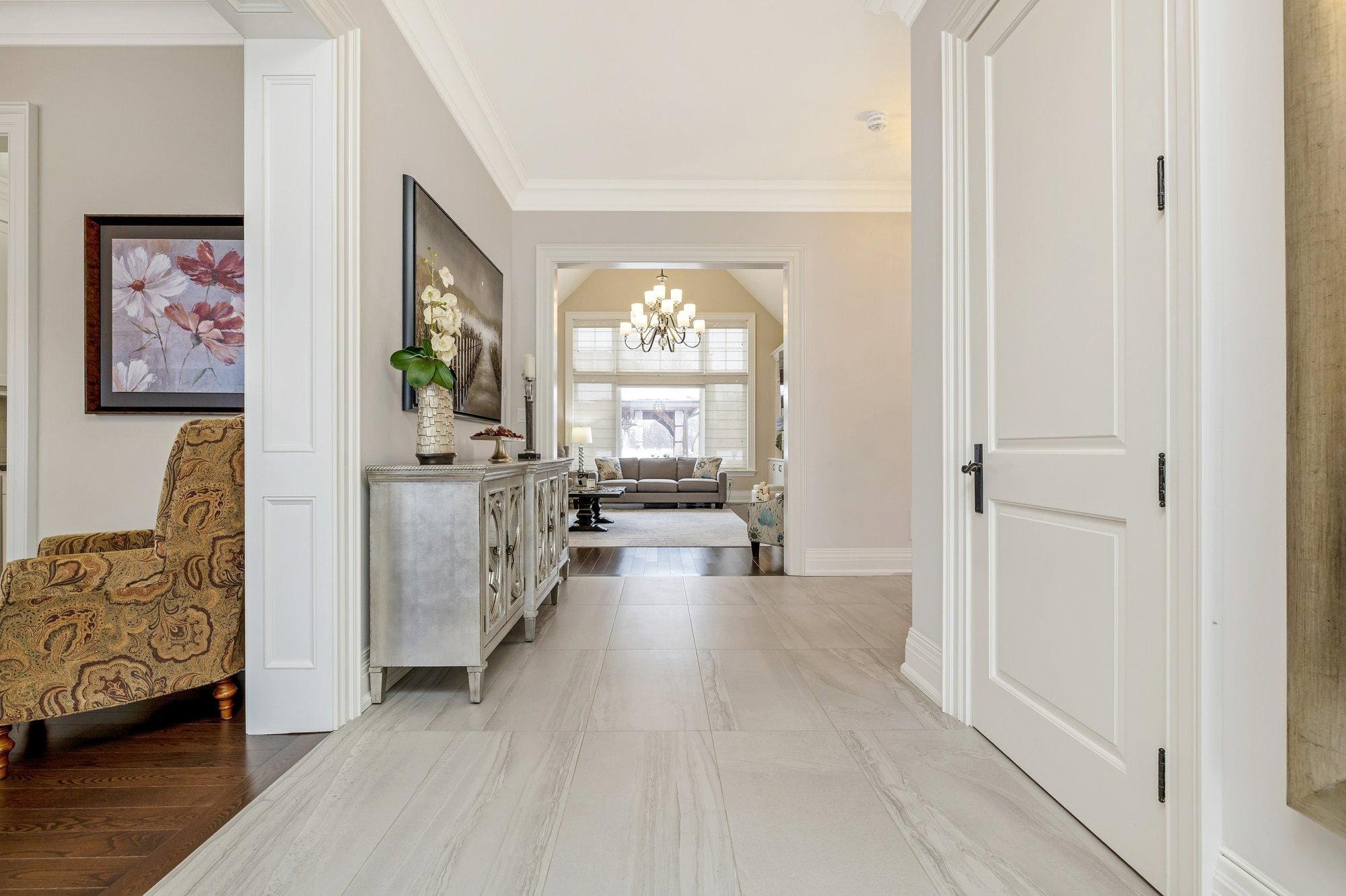 The main level is thoughtfully designed for both everyday living and entertaining. A private study offers a quiet space to work from home, while the formal dining room connects to the kitchen through a walk-through servery, making hosting effortless. At the heart of the home, the chef’s kitchen is both beautiful and highly functional, featuring Wolf appliances, a Subzero refrigerator, Miele dishwasher, and custom cabinetry with integrated storage solutions.