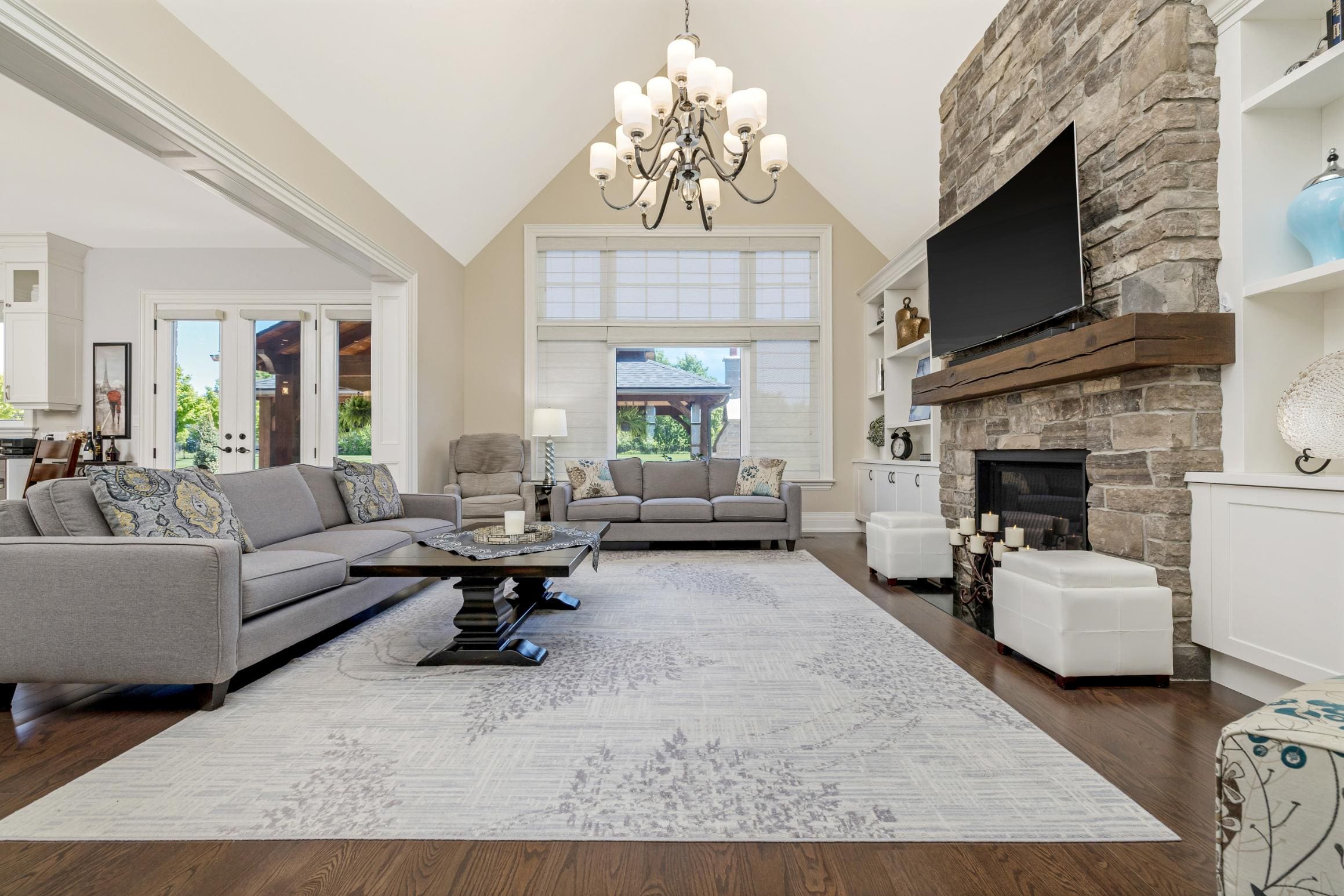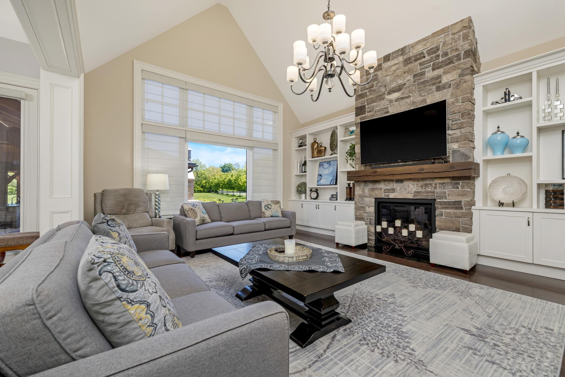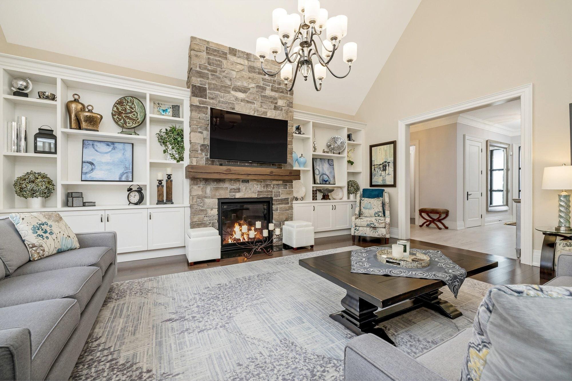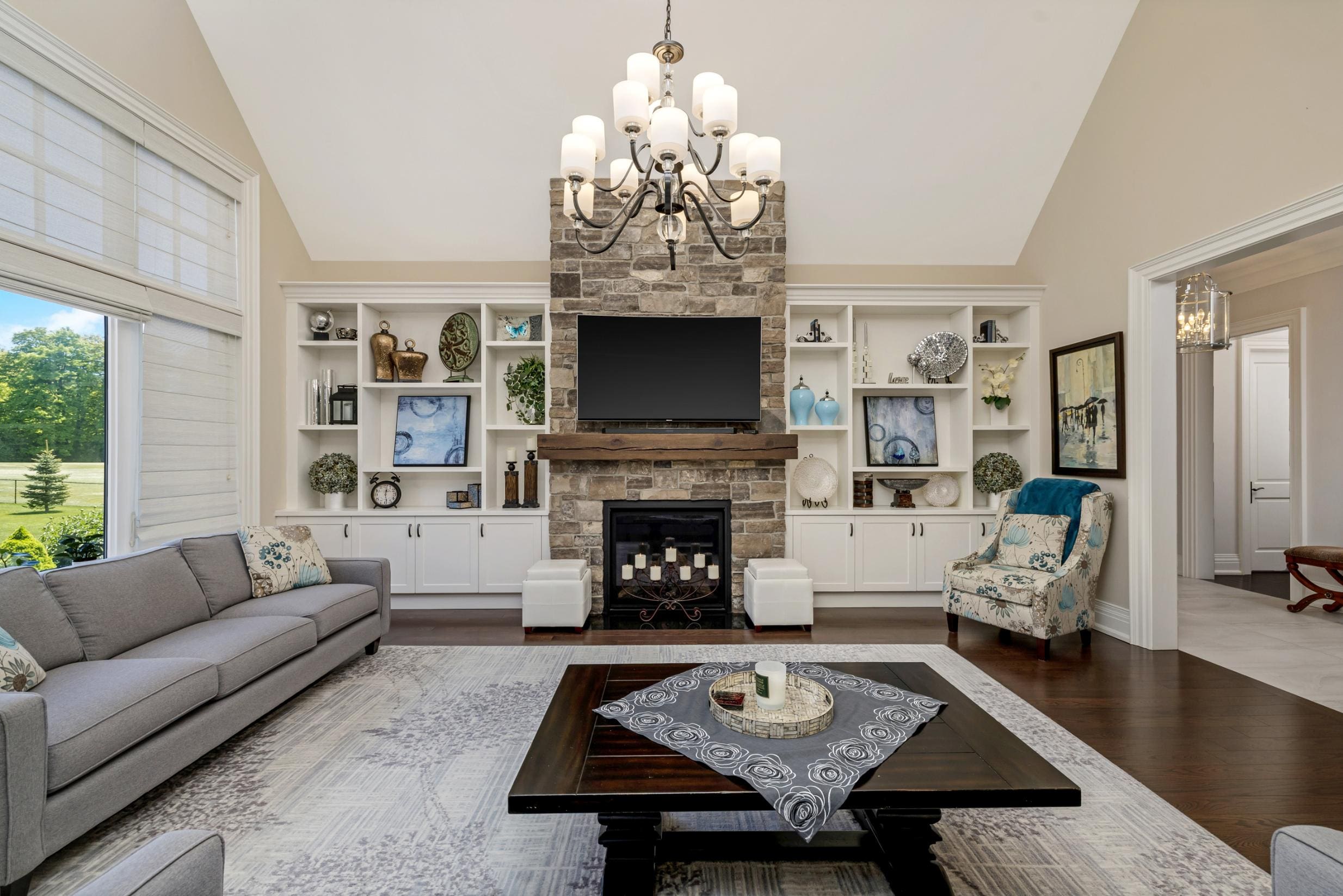 The open-concept layout continues into the breakfast area and great room, where a cathedral ceiling and striking stone-surround gas fireplace create a warm and inviting focal point. Large windows frame views of the backyard and bring in natural light throughout the day.