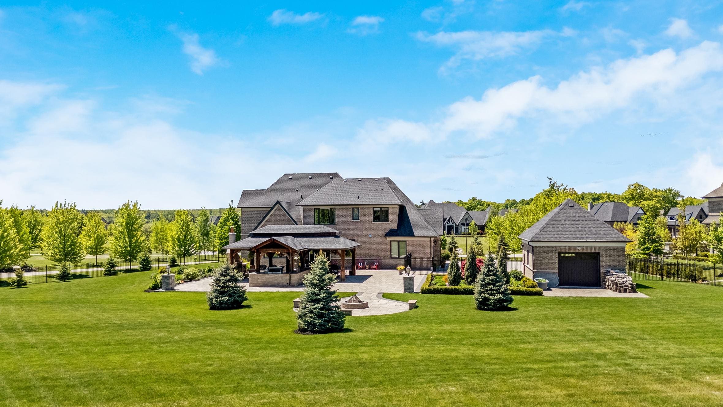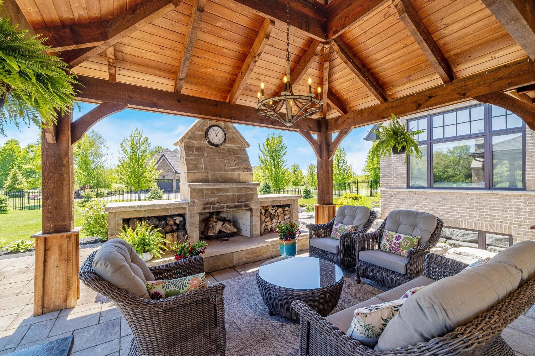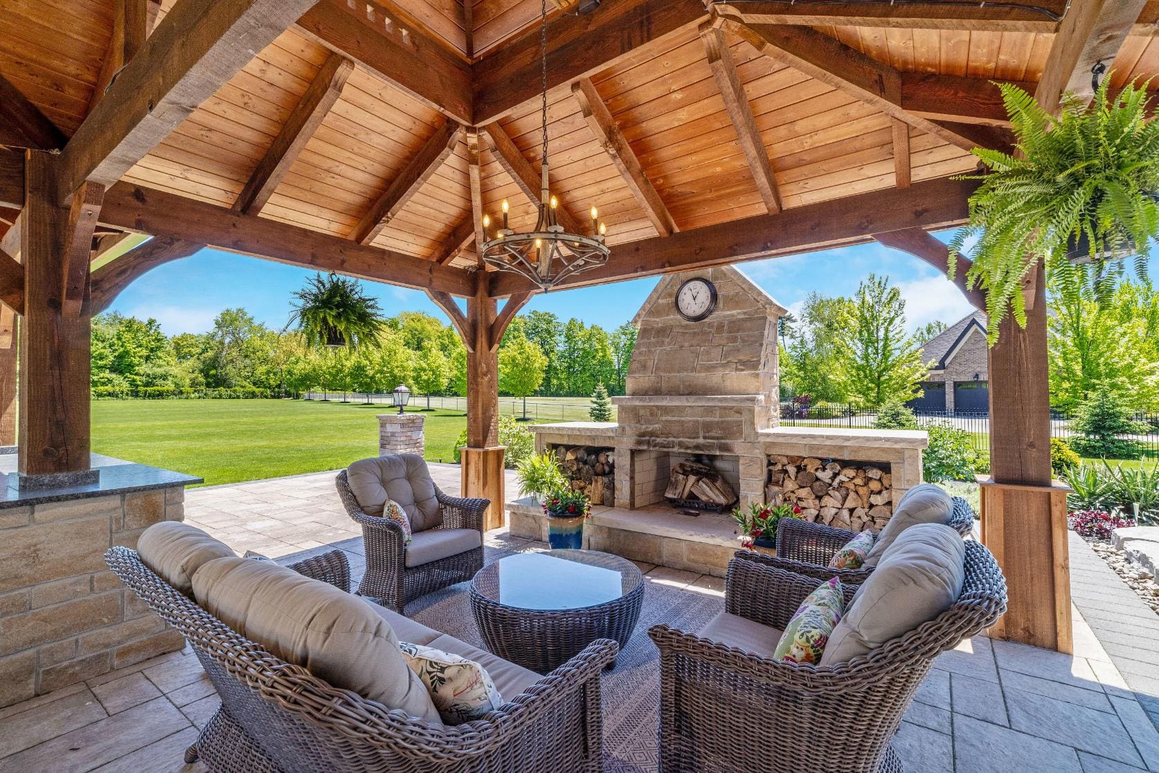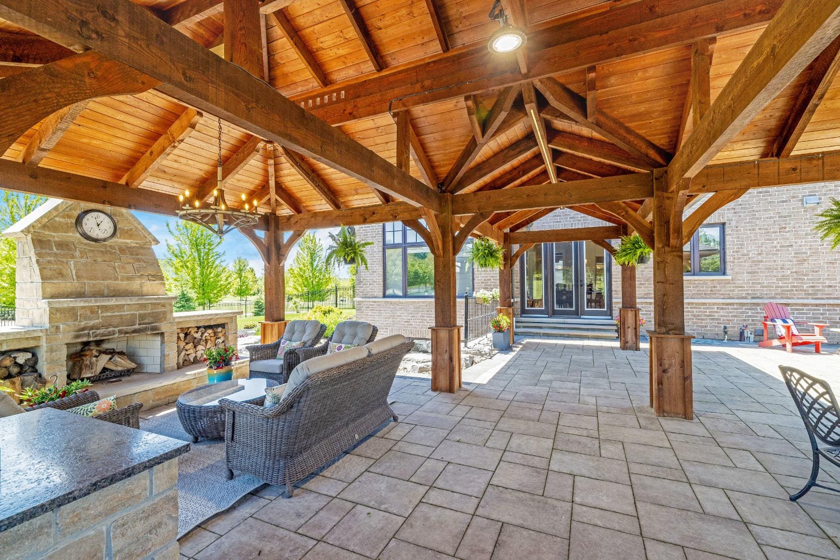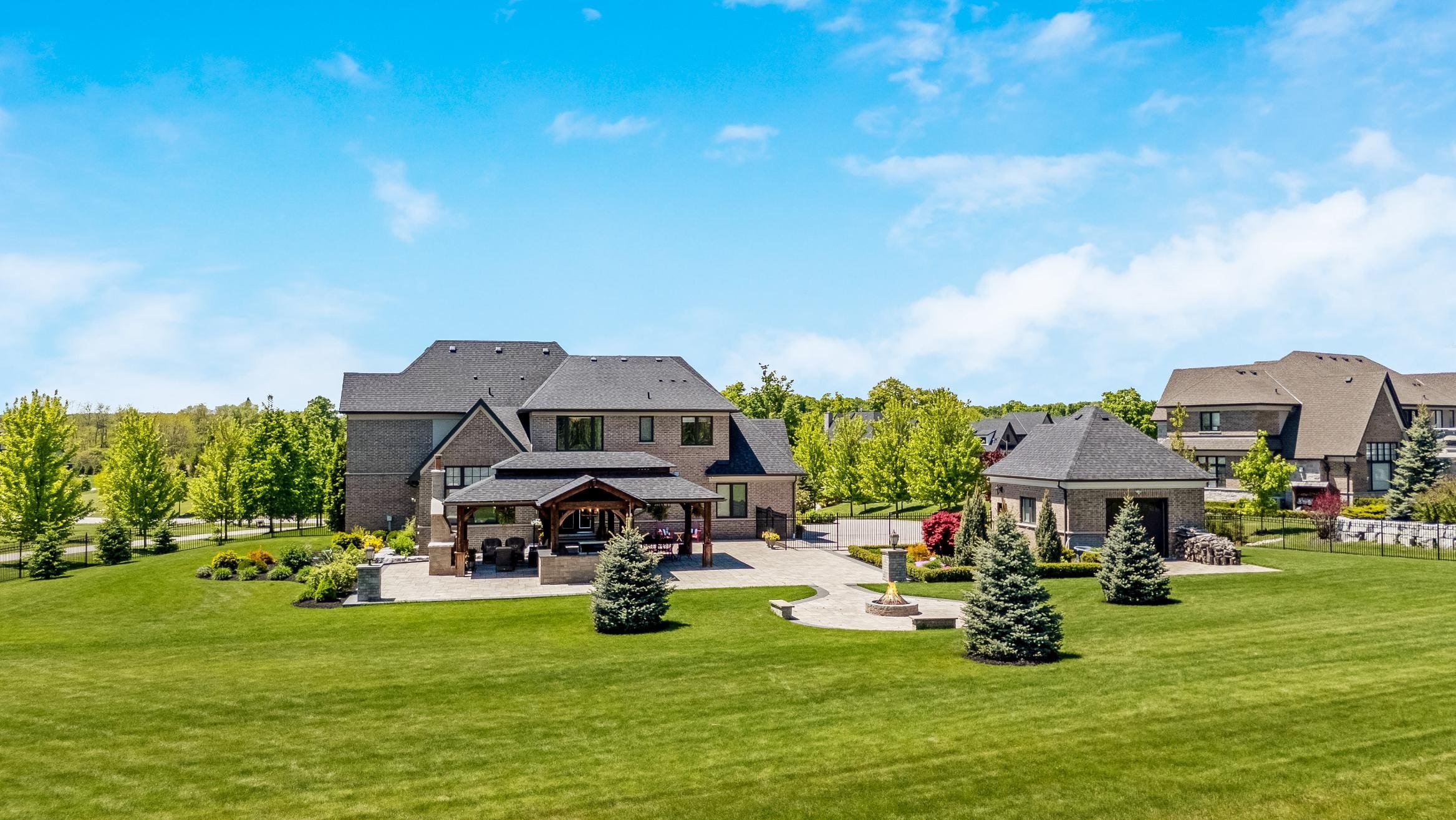 Outdoor living is equally impressive. Step through double doors with retractable screens to a covered patio, ideal for enjoying the changing seasons. Beyond, the backyard pavilion is designed for memorable gatherings, complete with a wood-burning fireplace, dining area, and fully equipped outdoor kitchen with built-in Napoleon BBQ, beverage fridge, and wine cooler. Set against a backdrop of open fields, this space offers both privacy and a true connection to nature.