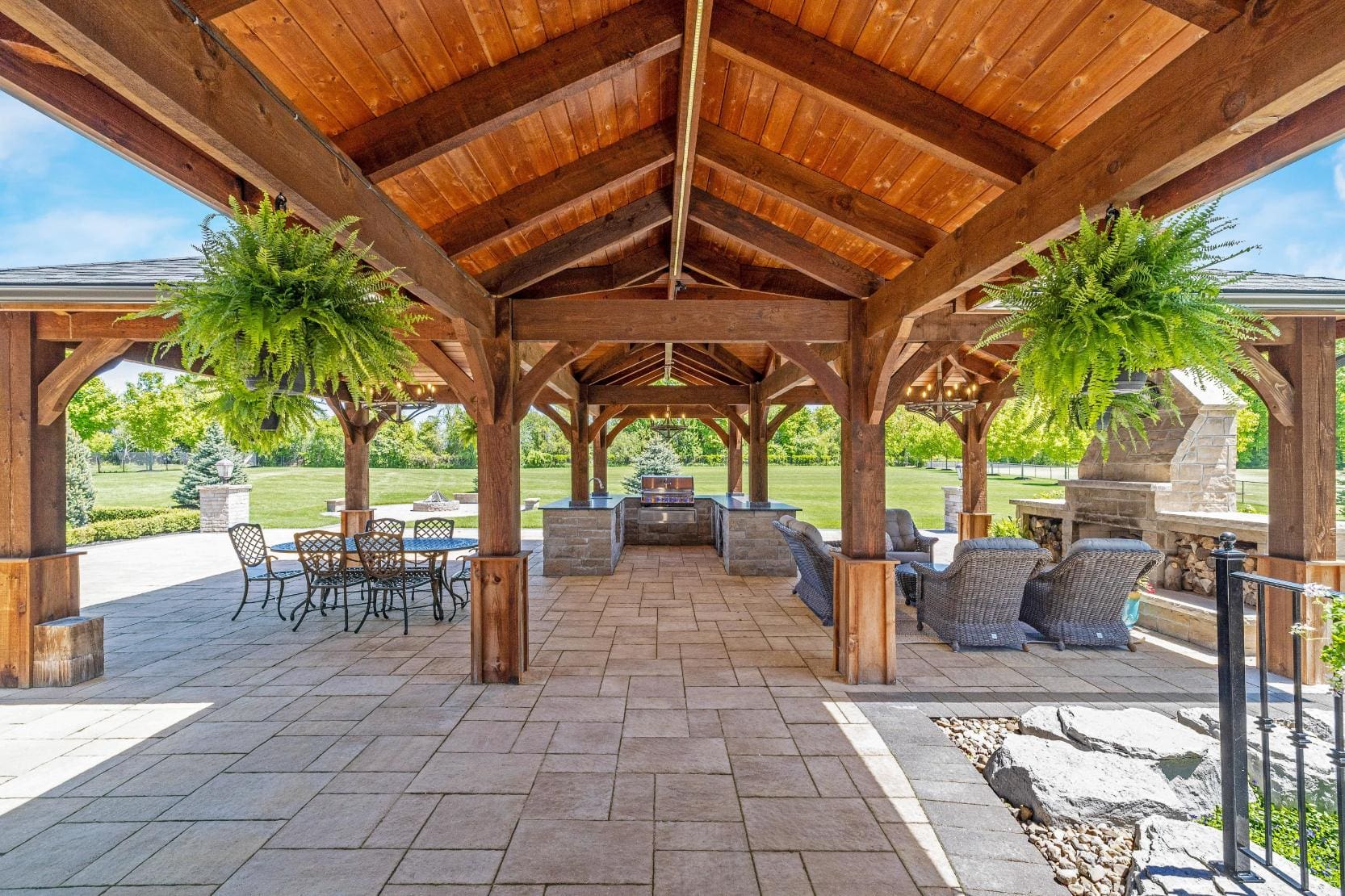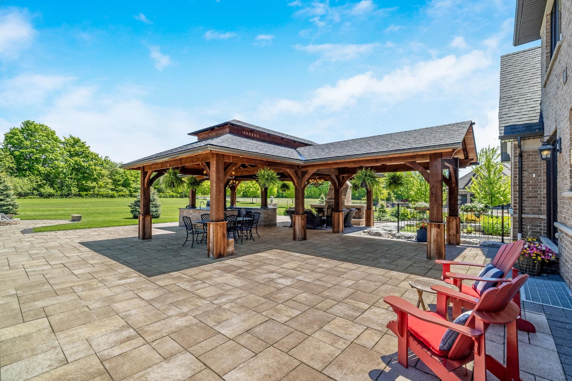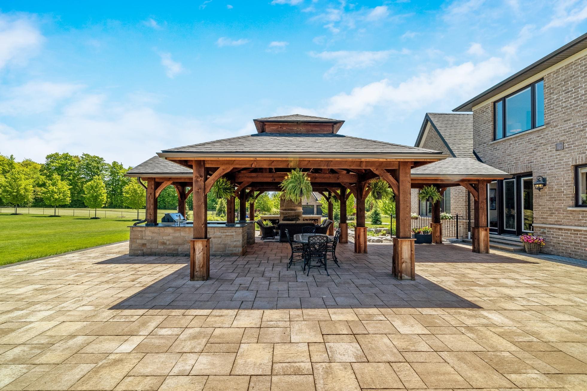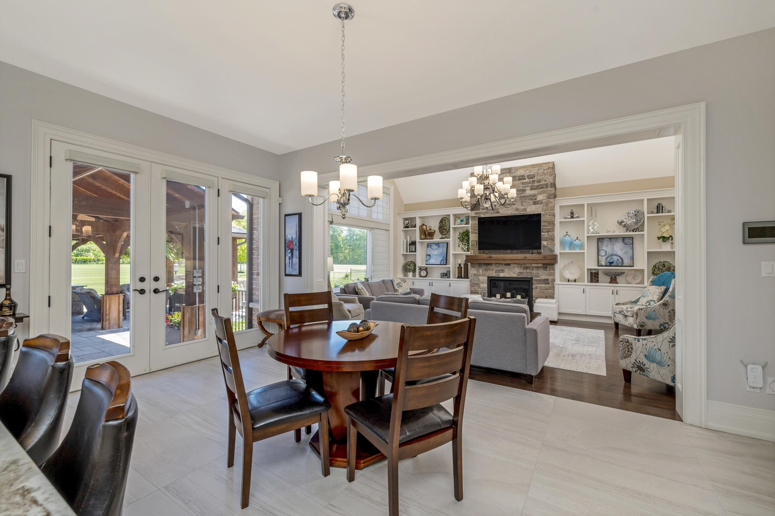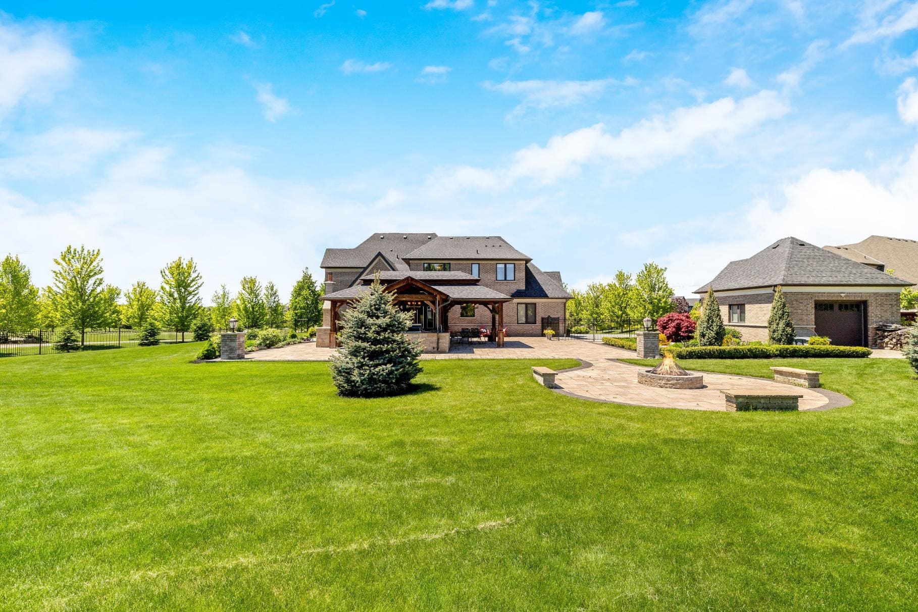 Outdoor living is equally impressive. Step through double doors with retractable screens to a covered patio, ideal for enjoying the changing seasons. Beyond, the backyard pavilion is designed for memorable gatherings, complete with a wood-burning fireplace, dining area, and fully equipped outdoor kitchen with built-in Napoleon BBQ, beverage fridge, and wine cooler. Set against a backdrop of open fields, this space offers both privacy and a true connection to nature.