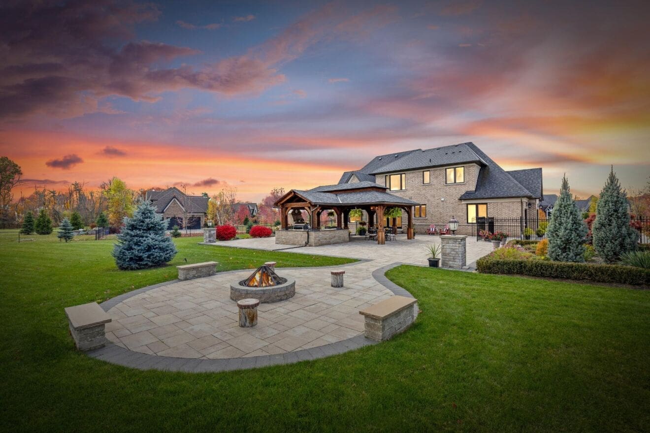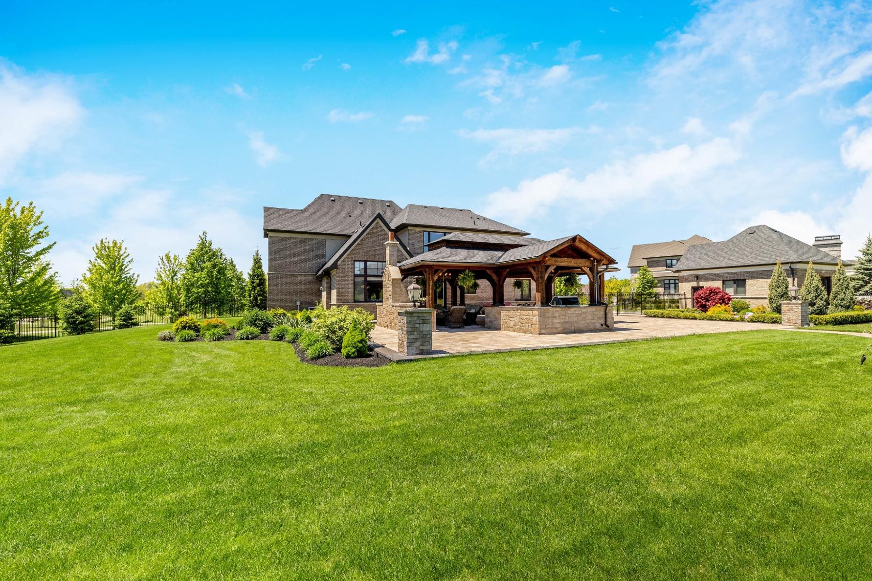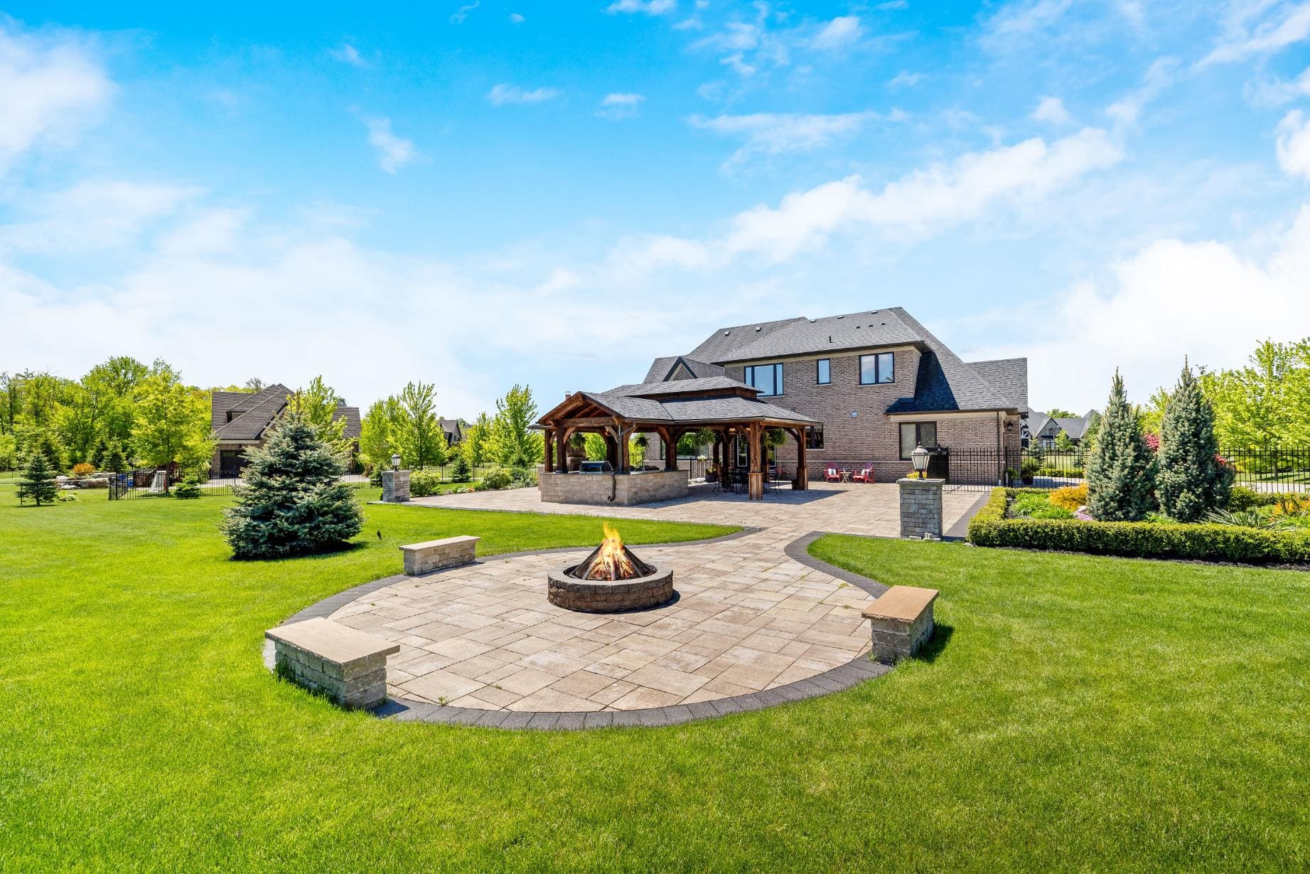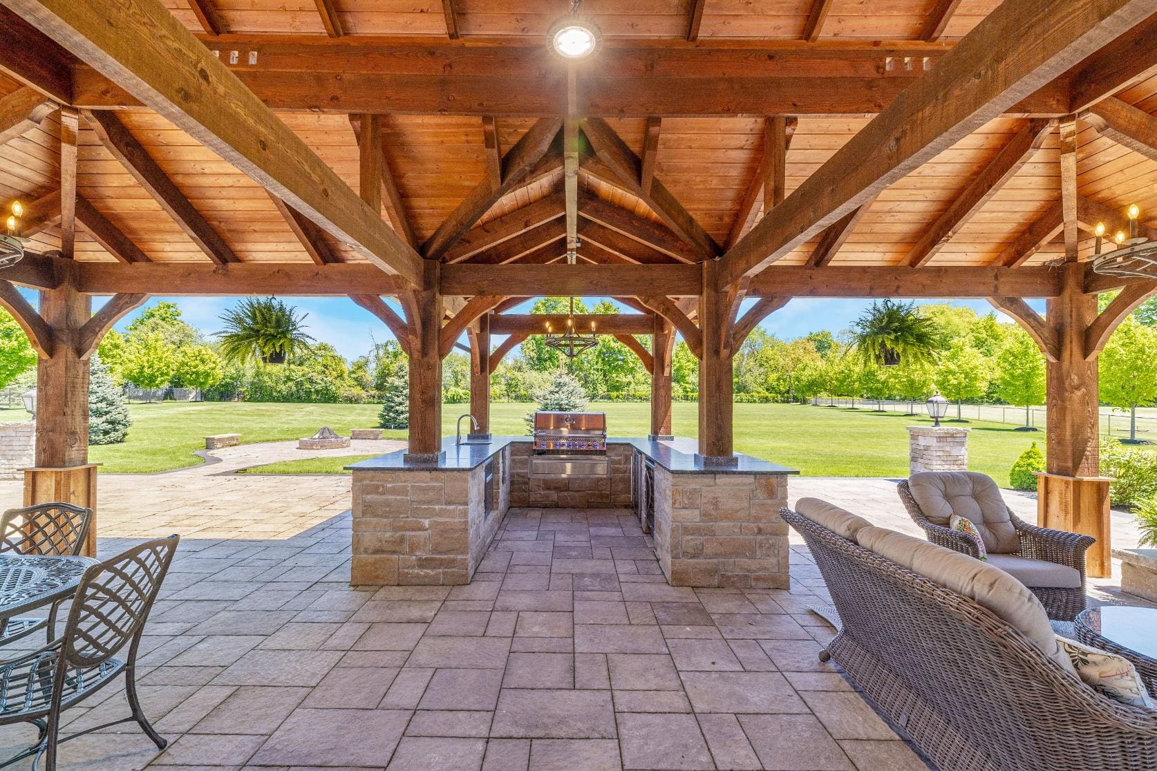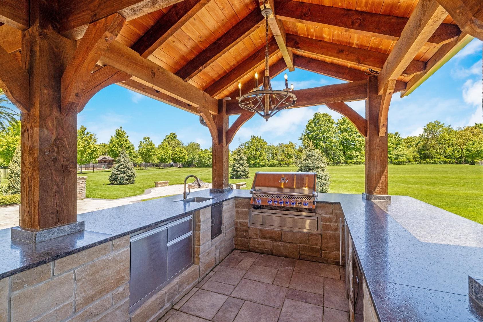 Outdoor living is equally impressive. Step through double doors with retractable screens to a covered patio, ideal for enjoying the changing seasons. Beyond, the backyard pavilion is designed for memorable gatherings, complete with a wood-burning fireplace, dining area, and fully equipped outdoor kitchen with built-in Napoleon BBQ, beverage fridge, and wine cooler. Set against a backdrop of open fields, this space offers both privacy and a true connection to nature.