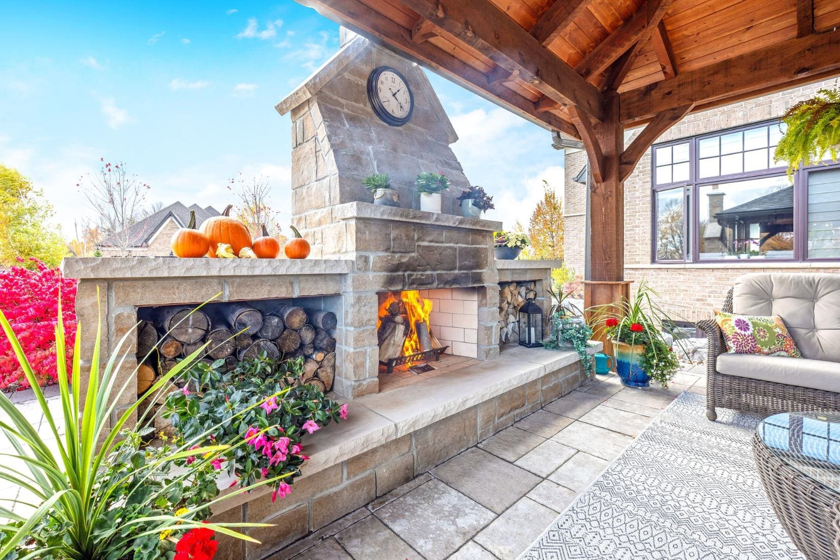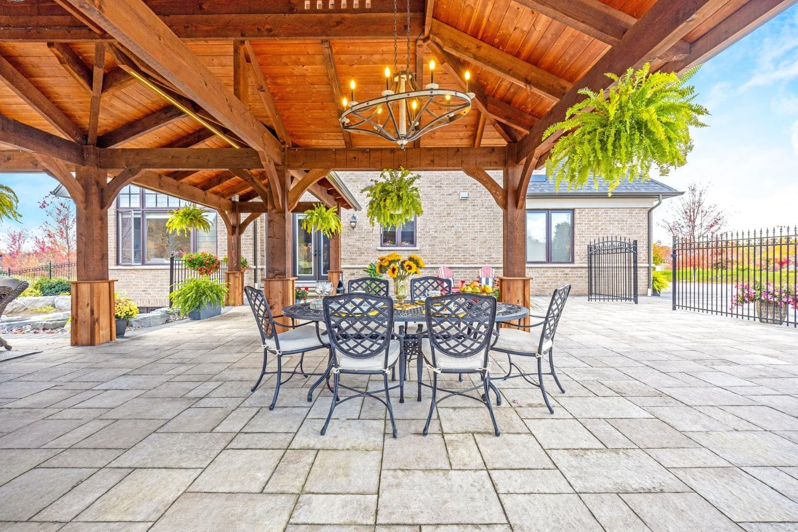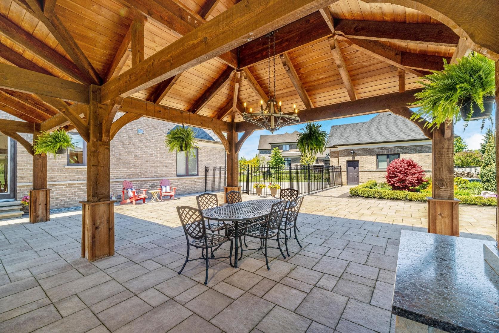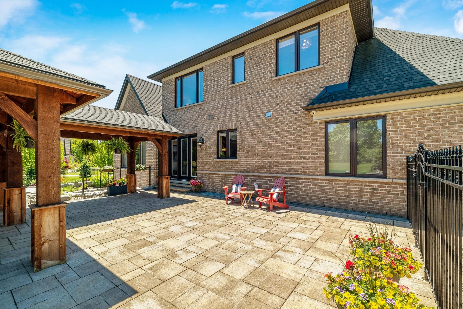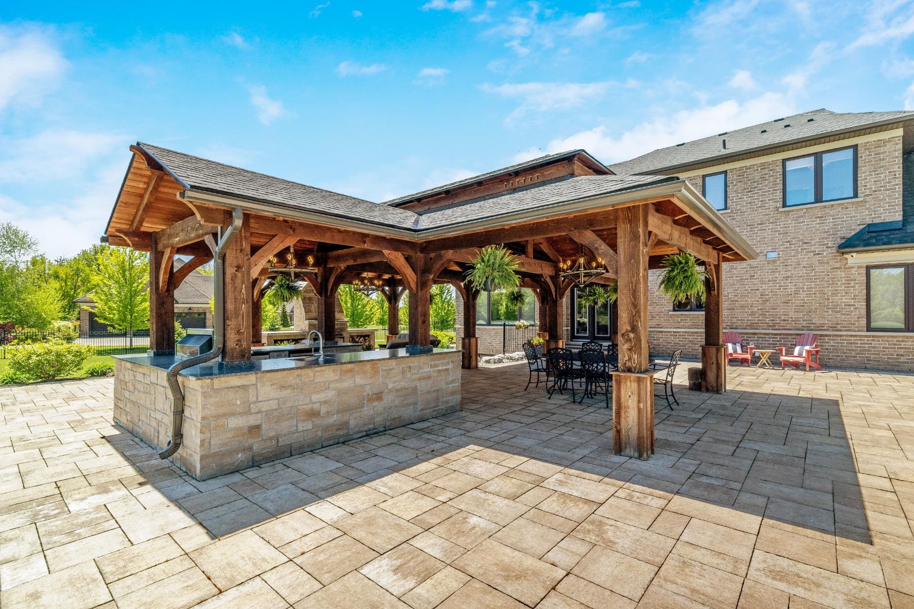 Outdoor living is equally impressive. Step through double doors with retractable screens to a covered patio, ideal for enjoying the changing seasons. Beyond, the backyard pavilion is designed for memorable gatherings, complete with a wood-burning fireplace, dining area, and fully equipped outdoor kitchen with built-in Napoleon BBQ, beverage fridge, and wine cooler. Set against a backdrop of open fields, this space offers both privacy and a true connection to nature.