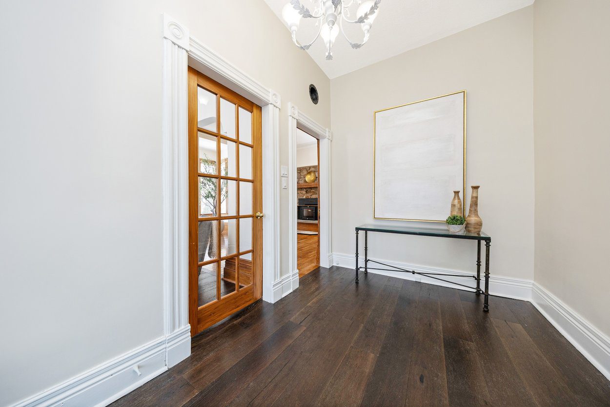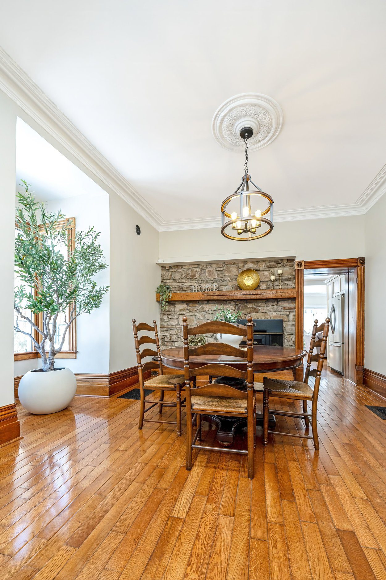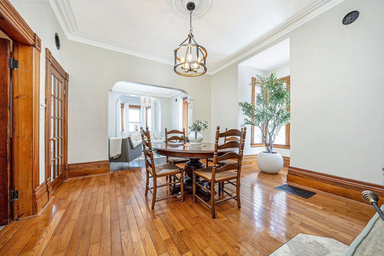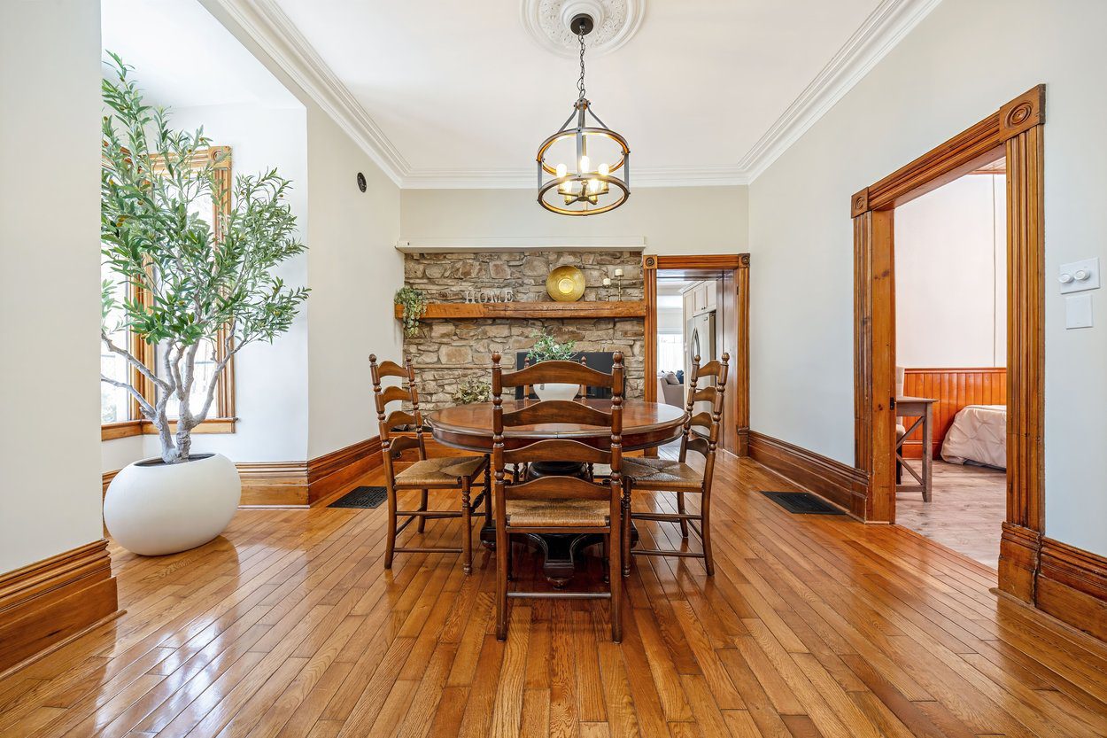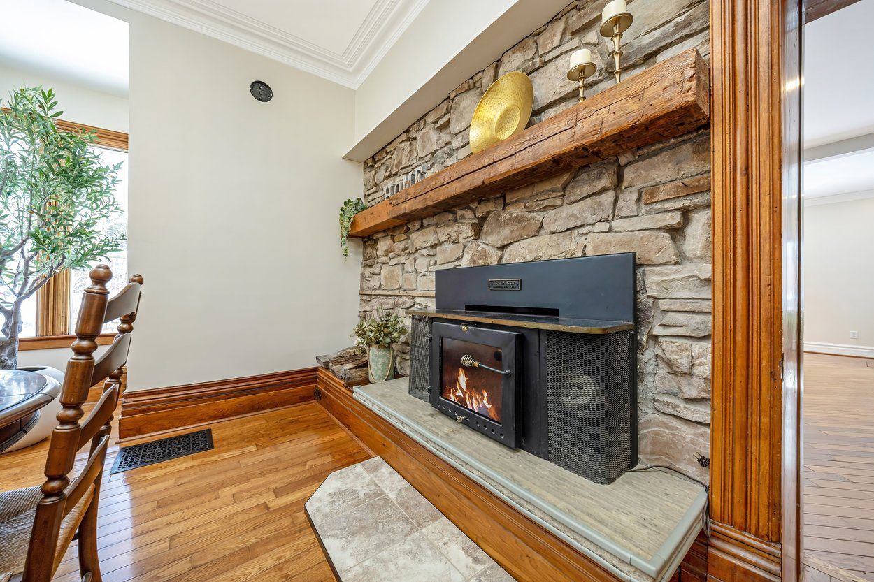 The living room is full of natural light with a bay window overlooking the front yard and three more large windows along the side. An arched wall, crown moulding and hardwood flooring add to the charm. The dining room features a beautiful stone wall and a classic wood burning fireplace, creating a wonderful space for gatherings. A separate office overlooks the side yard and features tongue and groove wood panel wainscoting and a chandelier, making it perfect for work from home.