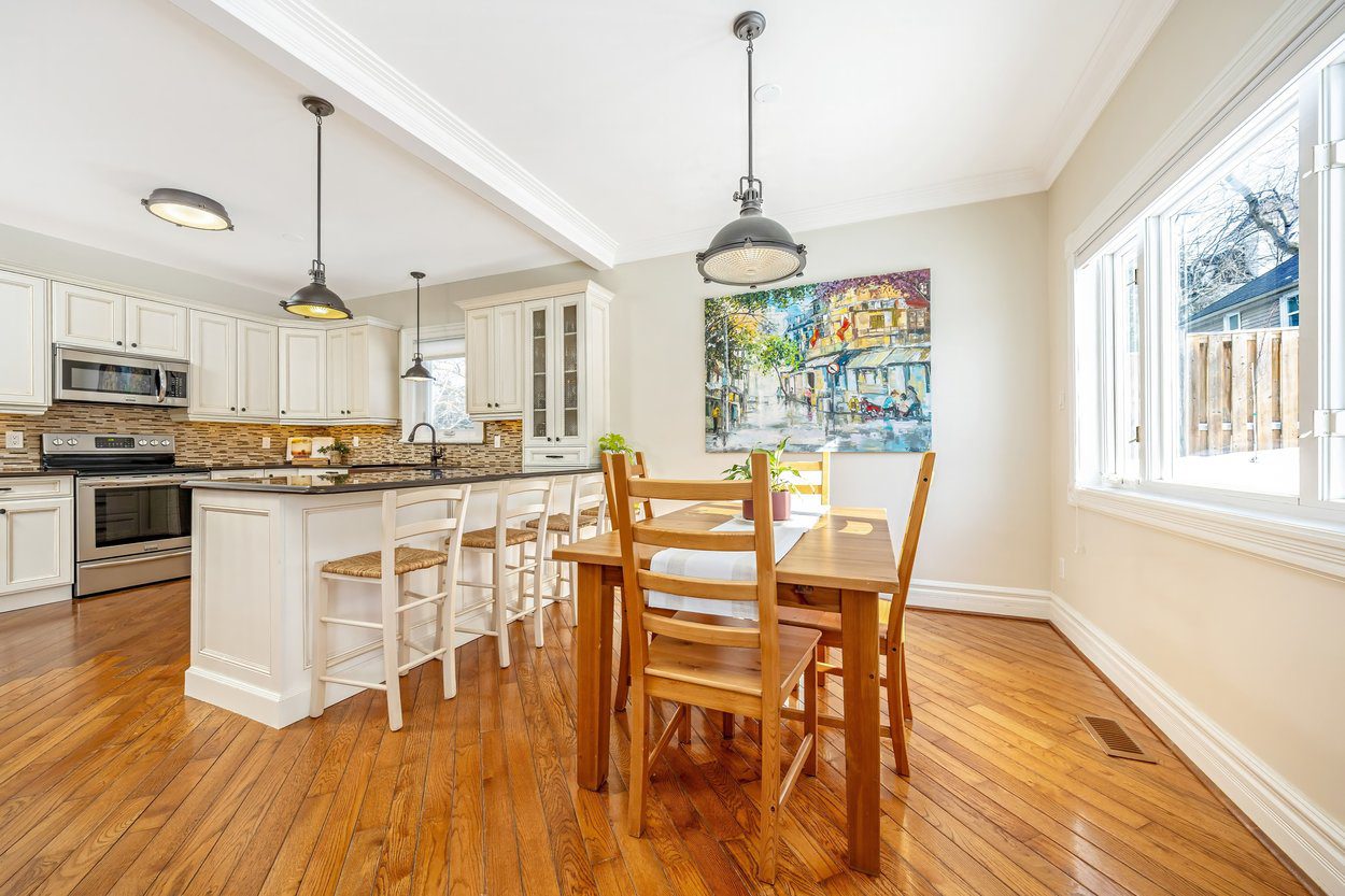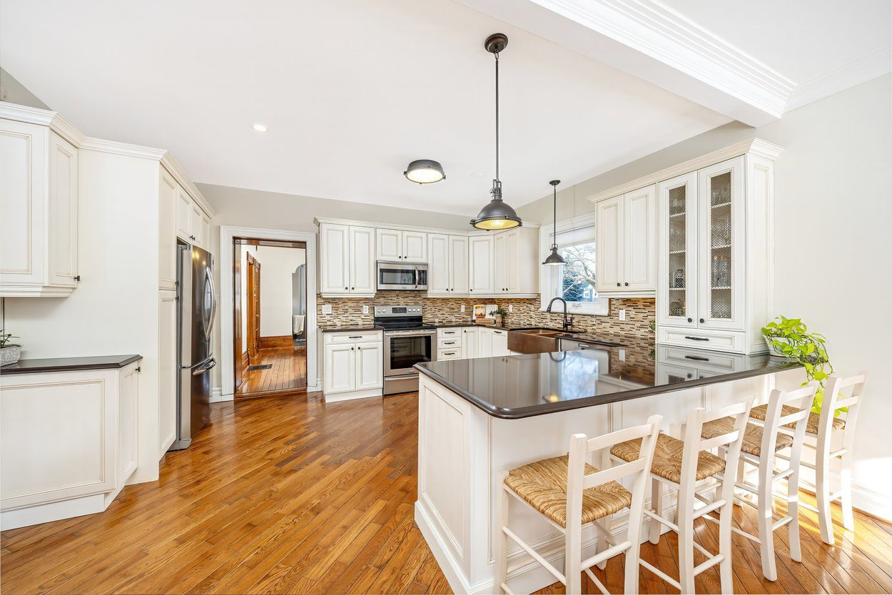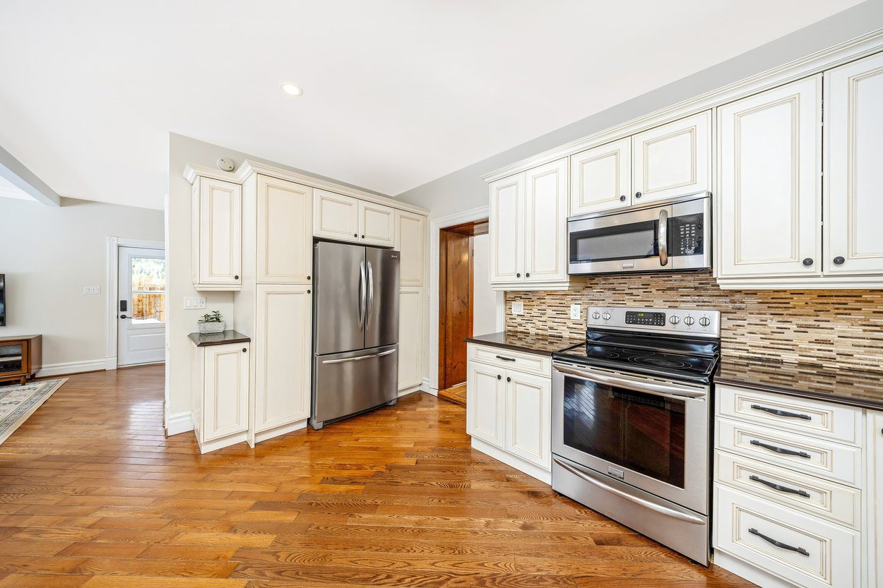 The updated kitchen offers shaker style cabinets, a double sink, built in microwave, wine cooler and a window over the side yard. It opens into the breakfast area and family room where a large rear window brings in peaceful views of the yard. This open space also includes a walkout to the side yard, making everyday living easy.