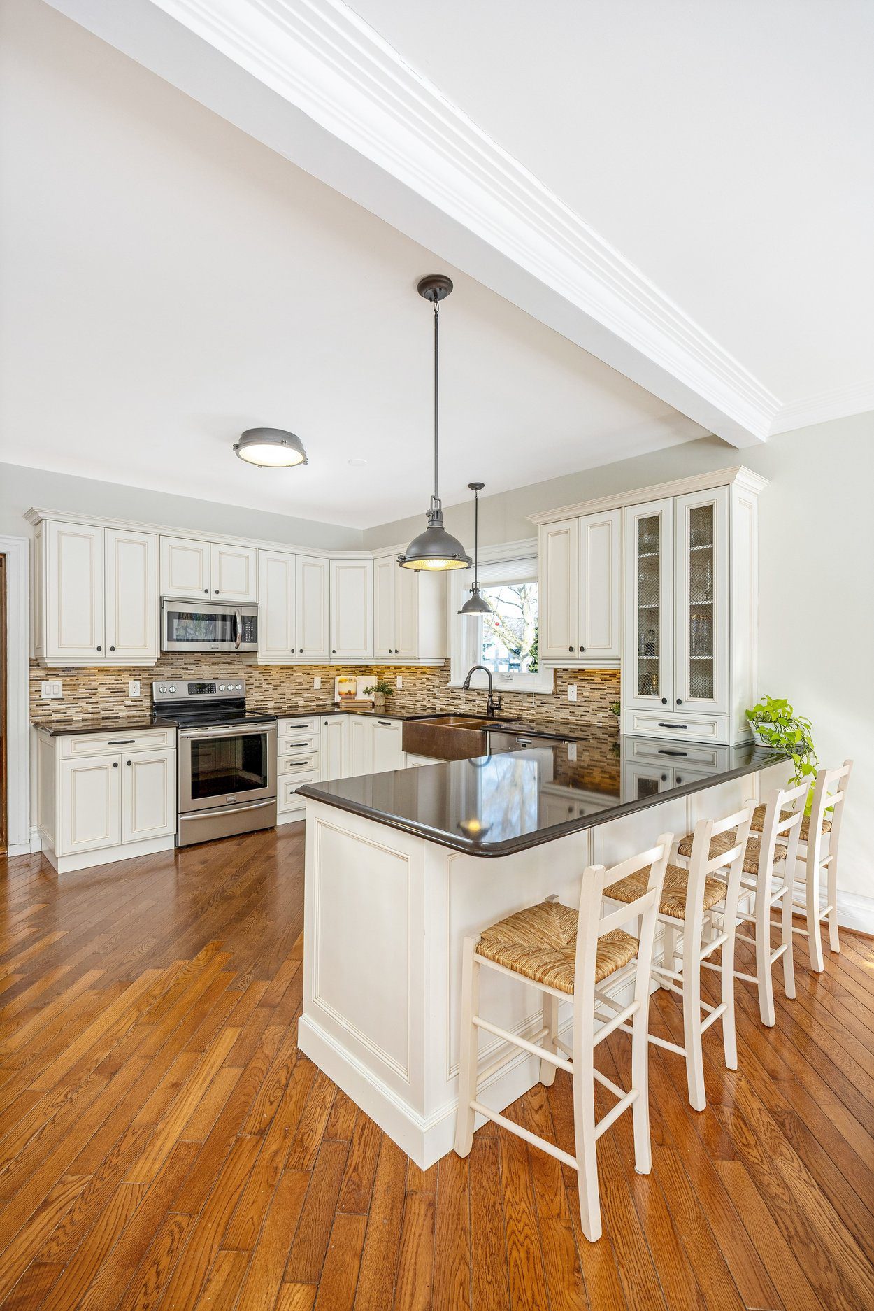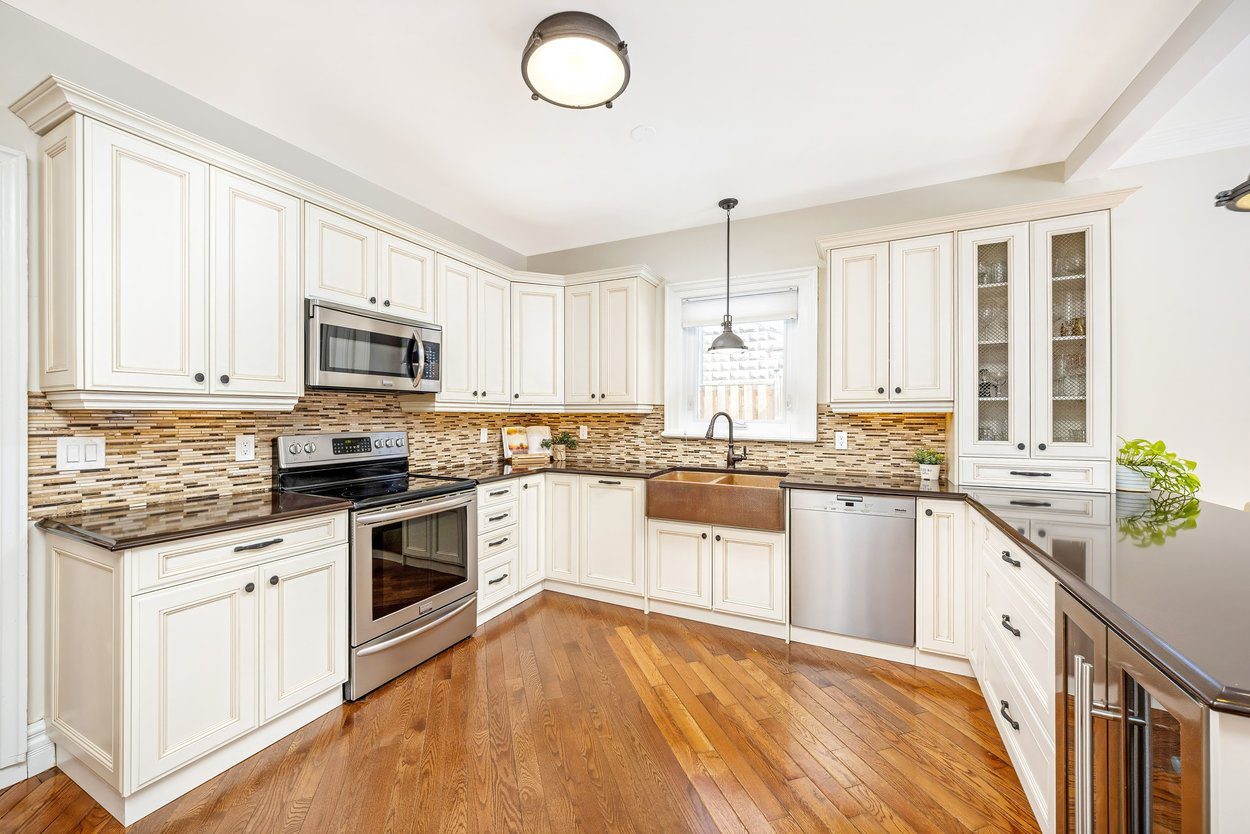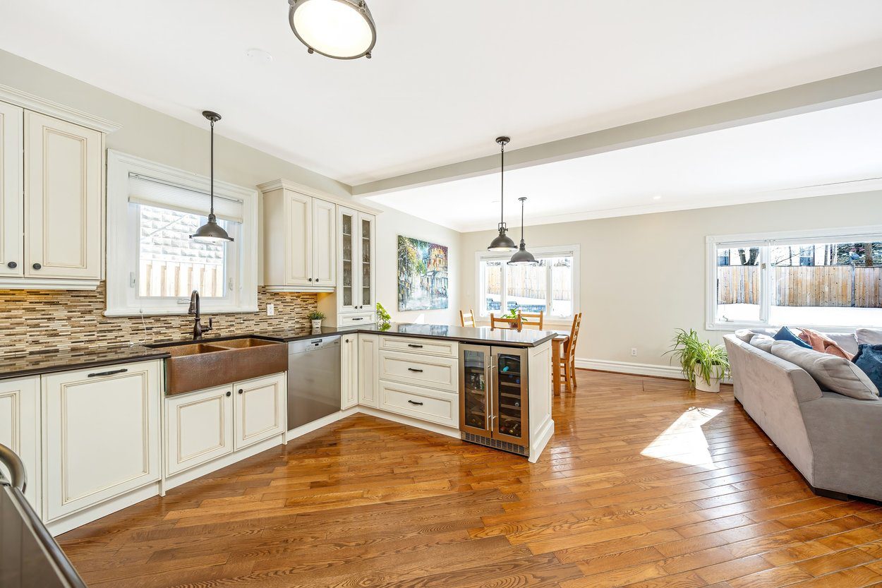 The updated kitchen offers shaker style cabinets, a double sink, built in microwave, wine cooler and a window over the side yard. It opens into the breakfast area and family room where a large rear window brings in peaceful views of the yard. This open space also includes a walkout to the side yard, making everyday living easy.