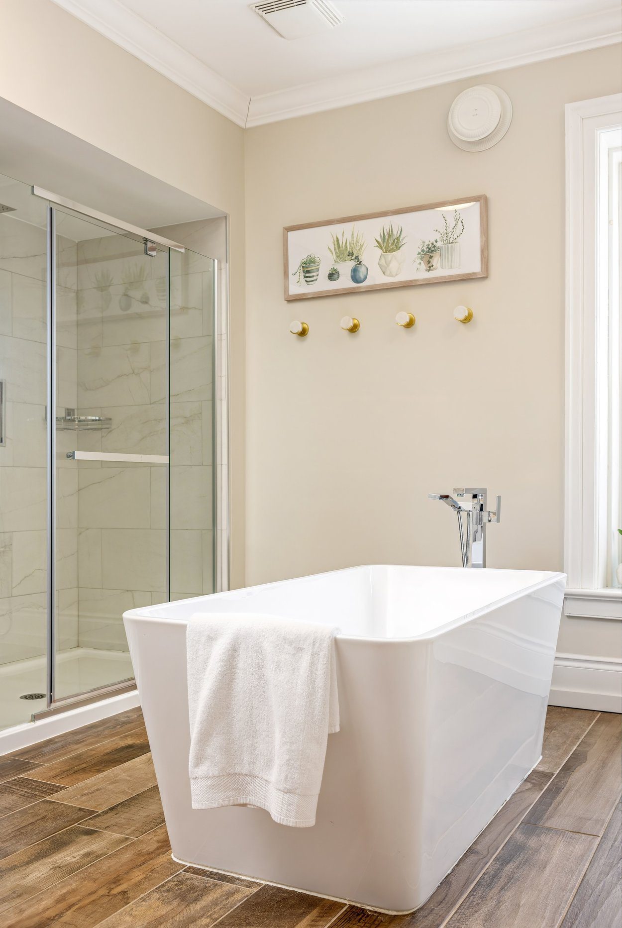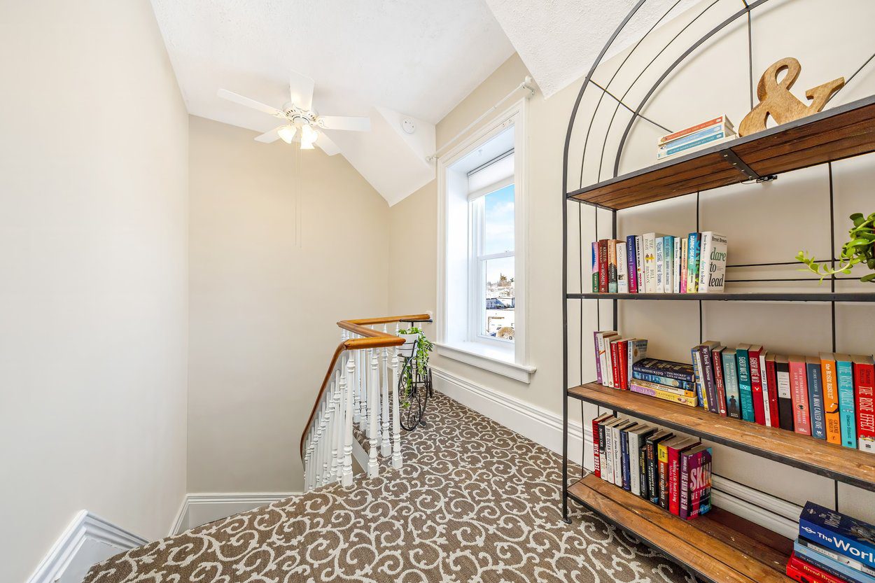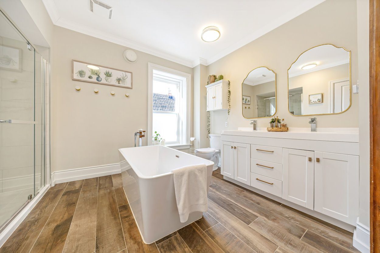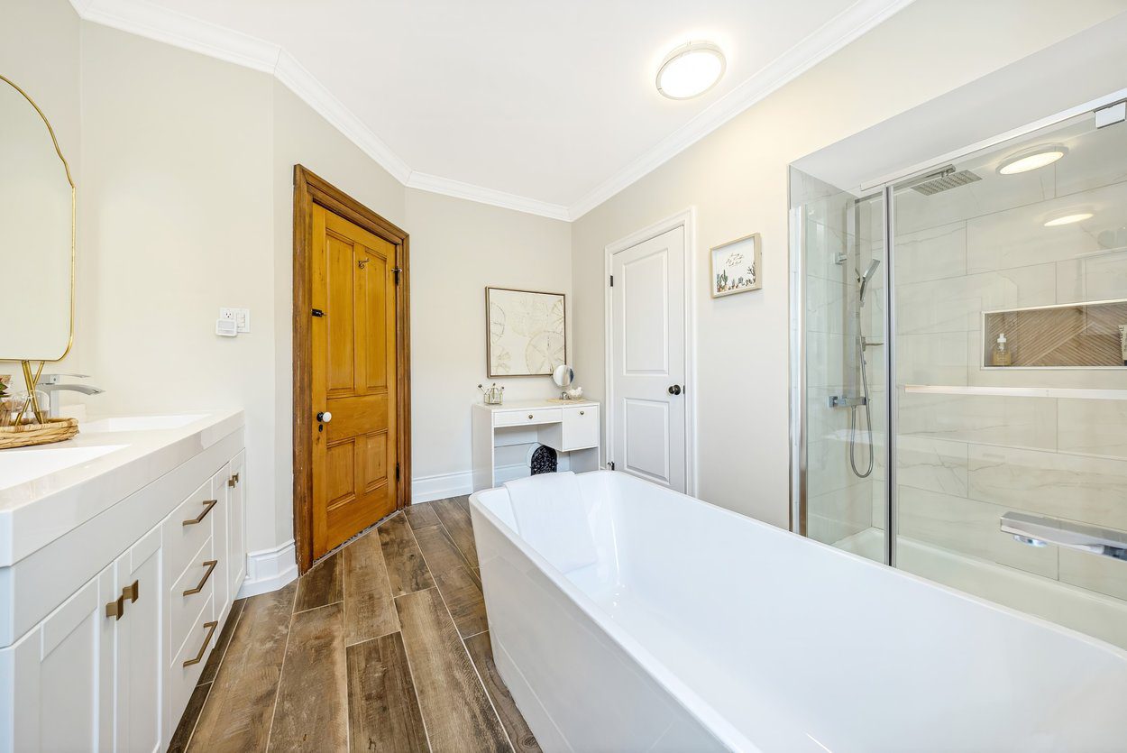Upstairs, the home has two bright bedrooms. The primary offers hardwood floors, a walk in closet and a calm view over the side yard. The second bedroom has hardwood floors, a step in closet and a beautiful bay window overlooking the front yard. The five piece family bathroom was renovated in 2019 and offers a free standing soaker tub, a walk in shower with a glass door, double sinks and a built in vanity.